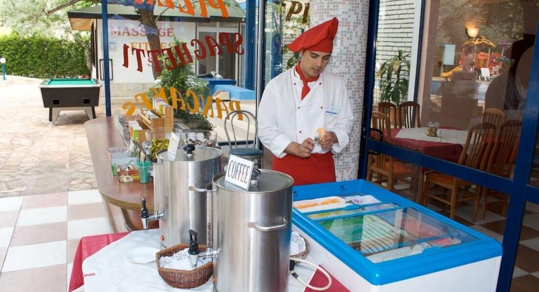 Теперь о главном, о покушать) Завтрак довольно однообразен, ну как практически в 90% отелей. Всегда яичница, та которая СкремблЭгс), но почему-то сладкая. Разные колбасы, много видов, жареные хлебцы под сыром и т.п. Есть стандартные мюсли, молоко, кофе, чай и т.п. Отдельно жарят глазунью или омлет, иногда даже с беконом. Я описываю, то, что кушал сам, там конечно есть и какие-то молочные каши, но уж простите, не моё) Далее, обед и ужин сразу, потому что очень похожи. Всегда несколько видов очень вкусного мяса, тушёного, запечённого и т.п. гарнир - овощи, картошка "в мундире", лазанья, разные макароны и т.п. ну и для вас, любители МакДака, да всегда есть фри с кетчупом) Всегда несколько видов сыров (только мягкие, твёрдых нет вообще). Так же 4-6 видов салатов, заправка как обычно, кефирный соус, но отдельно стоит нормальный майонез, аллилуя! Супов всегда 2, один лапша, либо куриная, либо мясная. Второй - пюре, что называется, в ассортименте. Конечно работает бар, вино, что-то по крепче, пиво и т.п. Кормят вкусно, практически нареканий нет. Кроме постоянно ломающихся кофейных автоматов и автоматов с чем-то под названием НектарНатура, что-то типа сока, довольно вкусно и всегда холодный, что на 33 градусах жары бодрит)