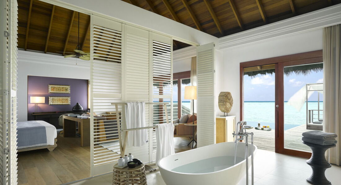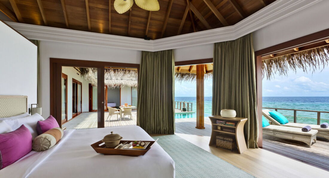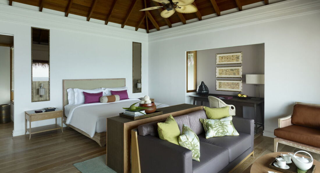 2 Ocean Pavilion (370 кв.м., розташований над водою на палях. Дві спальні, вітальня, їдальня, міні-кухня, тераса, ванна кімната, басейн, індивідуальний спуск у воду. Вид на океан. Також в номері є: послуги дворецького, пляжне приладдя, Ipod docking stations, аудіосистема BOSE, винна шафа, письмове приладдя, вентилятор.),