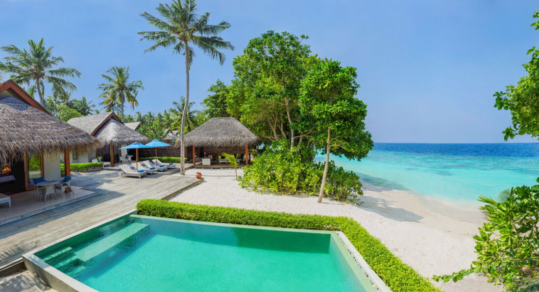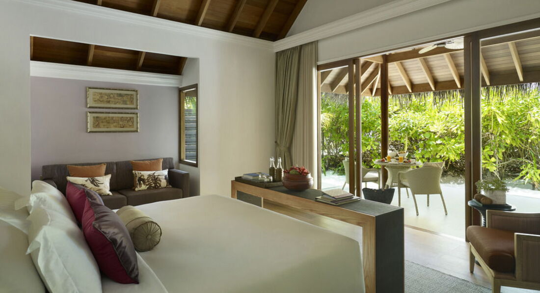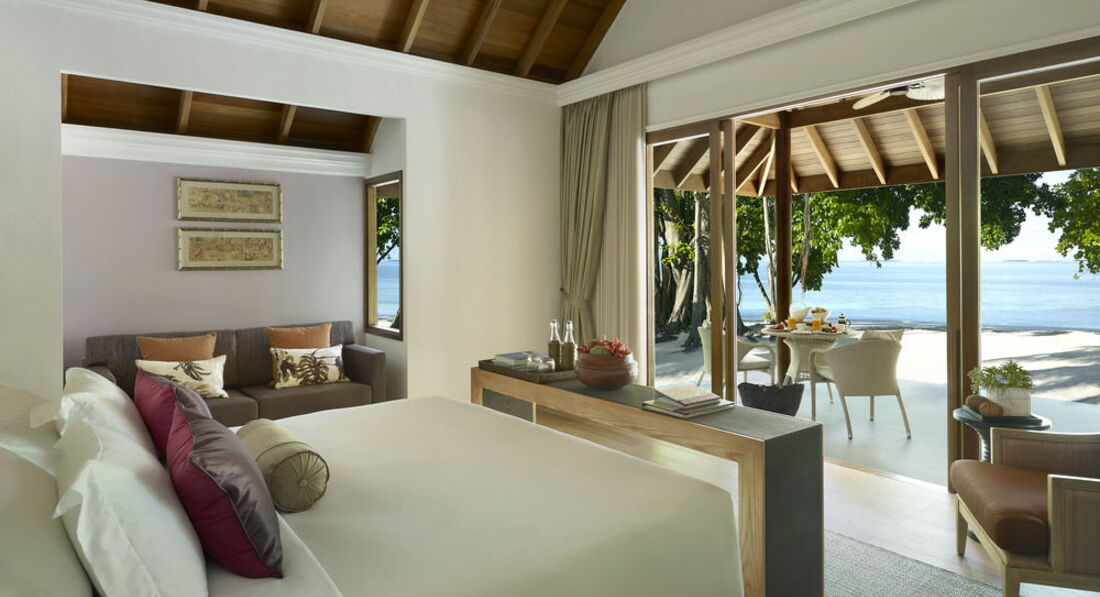 31 Beach Villa (122 кв.м., берегова вілла з приватним пляжем з виходом до багатого коралового рифу, внутрішнім двориком з терасою. Також в номері є: послуги дворецького, пляжне приладдя, Ipod docking stations, аудіосистема BOSE, винна шафа, письмо приладдя, вентилятор.),