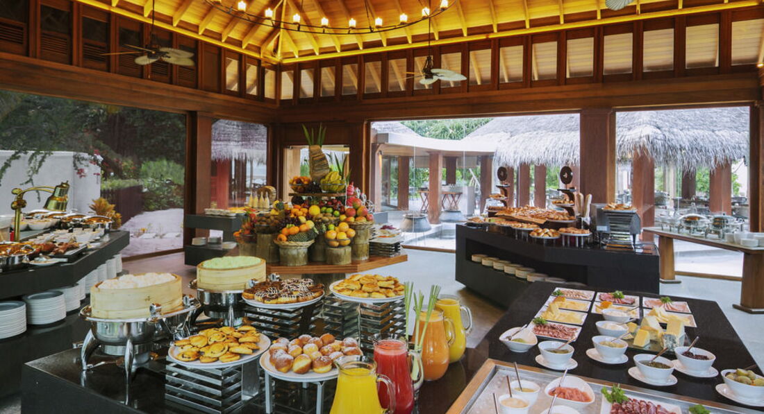 Завтраки проходят в основном ресторане The Market Restaurant. На мой взгляд, завтрак не плохой, так как я всеядная, но многое подстроено под постоянный контингент, японцев. Большое и разнообразное количество экзотических фруктов. Бесподобные манго и папая, потому что выращиваются там же на Мальдивских островах. Личи, маракуйя, питахайя, гуава, карамбола, лангсарт, мангостин, рамбутан, водяное яблоко тоже очень вкусные. А вот яблоки, ананасы, дыни, арбузы и груши - никакие. Очень хорошая и разнообразная выпечка. Огромное количество джемов, натуральный мед на сотах. Соки свежевыжатые, самые вкусные папаевый и апельсиновый. Иногда были кокосы с кокосовым соком. Часто рядом с соками стояла "кровавая мэри". Из основных блюд подходили хорошо приготовленные разнообразные овощи и жареная лапша. Куринное филе кари вкусное, но каждый день не поешь. И еще два "супер блюда": просто вареный рис и просто вареный рис вперемешку с горошком и кукурузкой, который назывался пловом. Разнообразие хлопьев и добавок к ним в виде изюмов и орешков. Молоко натуральное, обезжиреное и рисовое. Но полное отсутствие какой-либо каши. Один повар выпекает аладьи и вафли по заказу. Другой по заказу делает суп, у которого название "одно название". Кладет в дуршлачок уже сваренную рисовую лапшу, свежую зелень и, на ваш выбор, готовые креветочки, рыбные кусочки или куриные шарики. Затем опускает это в котел с кипятком секунд на десять, выкладывает в вашу миску, заливает тем же кипятком и.... наслаждайтесь на здоровье! Колбасная полка хорошая. Сырная очень хорошая: пармезан, бри, дор-блю, японский в белой плесени и др. Маринованные артишоки, вяленые помидоры, каперсы, оливки и много пикантных масел, уксуса и подлив-приправ. А вот с рыбой похуже. Сальмон малосольный отменный, а далее…. сырой (опасный для здоровья) тунец и, что бы вы думали, либо сельдь, либо копченая скумбрия. Такого я еще нигде не встречала. Однако было и счастье для души, большое количество и разнообразие листьев салата. Много разных йогуртов, фруктовый салат. В другой части оборудован европейский завтрак. Два вида жареных колбасок, жареный бекон и т.п. Готовят яичницу. Кофе, чай на выбор. Огорчало то, что каждый день было все одно и тоже. Вид на океан из ресторана красивейший. Можно расположиться как в зале под крышей, так и на открытых террасах. На террасах, конечно же завтракать бесподобно. Перед океаном и пальмами, под утренним нежарким солнцем.