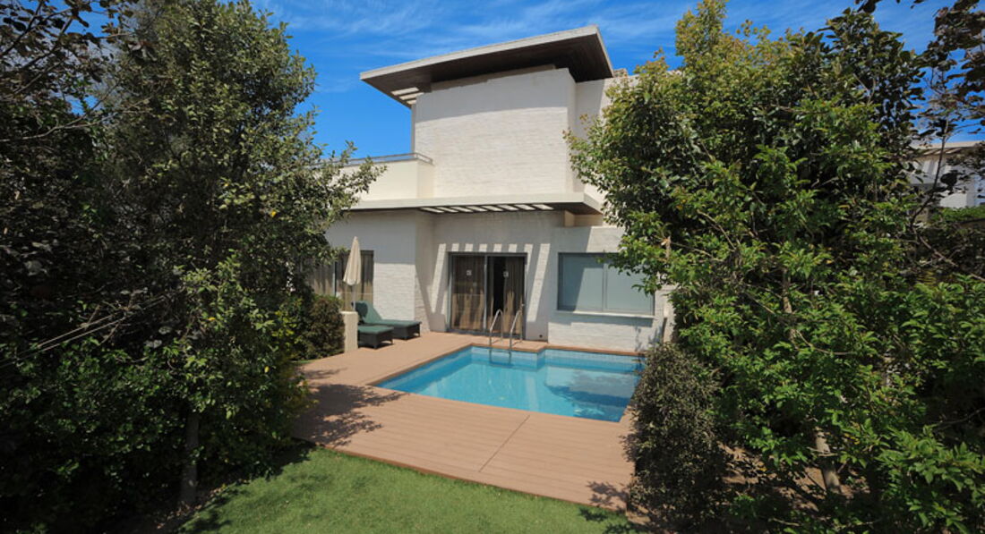 Мы сняли виллу с отдельным бассейном в этом отеле. Их примерно штук 8 в виде отдельных двухэтажных домиков в окружении садовых деревьев и кустарников, с аккуратными дорожками. Находятся они в 10 метрах от основного корпуса и рядом с дорогой. Внутреннее убранство самой виллы в принципе более менее порадовало. 2 комнаты, в одной полностью оборудованная кухня, и раскладной диван ( на нем спали наши дети), в другой спальня. 2 санузла, душ и гидромассажная ванна. Из номера выход к небольшому личному бассейну и несколькими лежаками. Довольно уютное размещение.