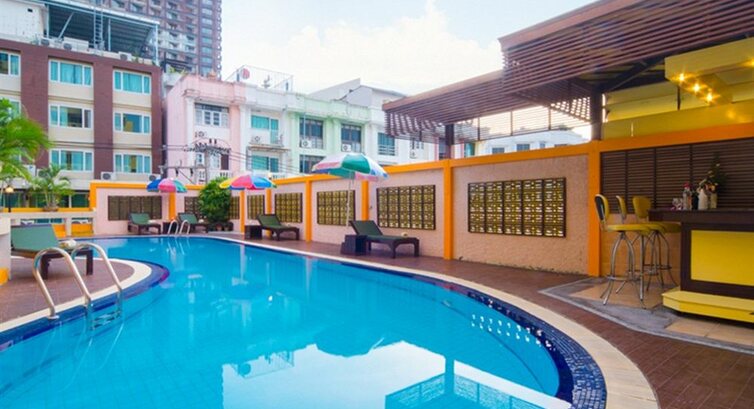 Отдыхали парой в ноябре 2015года. Отель в центре самой движухи, вокруг отеля куча маленьких баров, караоке, кафе, с 6 вечера и до 6 утра тусовка, беруши нас не спасли. Просили номер повыше, но сказали что стандарты (как мы заказывали) только на 2 и 3 этажах и все заняты... выводы делайте сами, особенно те кто с детьми точно не сюда! Номер стандарт,на втором этаже, маленький,заселили сразу. Прочитав отзывы надеялись на лучшее, но по факту цена-качество не соответствуют действительности. Фото на сайте явно отфотошопленные. Стены как в больнице бледно желтого цвета... В номере мебель старая: 2спальная кровать, прикроватная тумба, шкаф с вешалками из толстой проволоки, тумба у входа (что то типа обувницы), стол на котором стоял старенький телевизор и всякие чипсы, орешки (платные), большое зеркало, один пуфик. Столика маленького передвижного (элементарно перекусить) не было!!! Пытались подвинуть "обувницу" , она тяжелая.. В номере не перекусишь.часто ужинали в кафе или на улице, прям возле отеля, есть маленькая зона с 2мя столиками.. Балкон маленький ,на нем стоит какой то кондер, от которого работает кондер тот что в комнате, ужасно громко работает! Ночью спали в духоте без него..Мыльно рыльные каждый день новые, кусочек мыла, шампунь, палочки ватные, шапочки для ванной, все по 1шт даже если вас двое но мы не пользовались (только мылом, хватало), не могла прочесать волосы после отельного шампуня, купила в севен элевен пантин, очень хороший и домой еще привезла... Полотенце одно большое на каждого, про маленькие не помню, вроде были и один коврик для ног в ванной... Есть душ, закрывается шторкой, рядом туалет и раковина, после приема душа весь санузел был мокрый, поэтому коврик для ног всегда перетаскивали из него в комнату, чтоб не намок, и при выходе можно было досушить на нем ноги и обуть тапочки. Живности в номере не наблюдали. Просили номер выше категорией (соответственно этажем), попросили доплату за 10ночей в 2000батт. Мы сначала конечно посмотрели номер, и решили остаться в своем. Номер по размерам такой же, только есть маленький столик и стул, сейф в шкафу,это все различия...уборка каждый день, смена полотенец, пополнение мыльно рыльных, пол подметают, не моют (это наверное особенность азии), пролили газводу, осталось пятно на полу, помыли. В качестве чаевых оставлчла маленькую шоколодку Аленка и жвачку лав из. На качество уборки не влияло, но забирали точно. Пару раз забывали на кровати планшет, приходили а он аккуратно лежал на столе или тумбе,тоесть случаев с кражами не наблюдали, все ценное отдавали в сейф на ресепшен, ячейка на ключе, ключ отдают в руки на весь отдых, потеряете штраф, сколько не помню... Не меньше 1000 батт. Персонал хороший, пару раз оставались поспать подольше,но уборщица все равно стучала до последнего, просто меняла полотенца, ставила воду и извеняясь уходила... На ресепшен одна девочка не плохо понимает и говорит по английски,с остальными только жестами. На кухне очень приятная девушка, тоже не плохо говорит на английском. Всегда улыбаются. Завтраки нормальные, иногда менялись фрукты, вроде 2 или 3 вида было, голодными не останетесь. Национальностей в отели много, китайцев не много. Бассейн на третьем этаже, симпатичный, не вонючий, чистый, есть несколько лежаков. Тех кто любит тусить до утра можно и этот отель, тем кто любит спать в тишине точно н