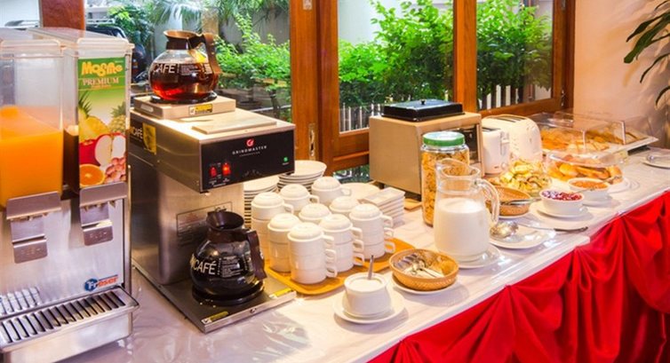 на выбор несколько гарниров, курица, сосисочки, копченое мясо. овощи и фрукты. порадовало наличие выпечки! дело в том что на улице этого найти практически невозможно... соки, чай и кофе. сытно и вкусно. уезжая на экскурсию рано утром заказывали БРЕКФЭСТ БОКС - очень скромно, но все же... от голода спаслись.