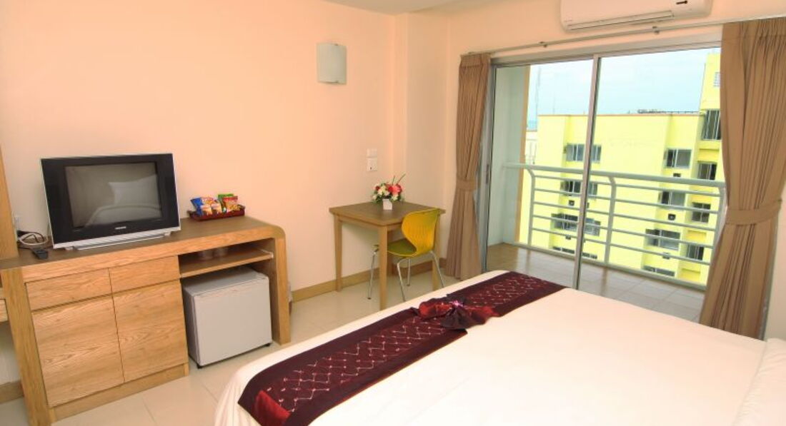В итоге приехали в Паттайю, нас пересадили из большого автобуса в микроавтобусы (до нашего отеля на большом не проехать, дорога узкая). Вместе с нами приехали еще 2 пары. Ключики дали очень быстро. Жили в номере 410. Номер нас вполне устроил. Большая кровать, стол, тумбочка, телевизор (2 русских канала), шкаф и т.д. Все в хорошем состоянии, ничего не разваливалось. Вид с балкона на соседнее здание + частичный вид на море. Фена и чайника нет. Я об этом читала, поэтому привезла с собой. Есть небольшой сейф в номере. В нем ничего не хранили, документы и деньги складывали в чемодан с кодовым замком. Остальное не прятали - ничего не пропало. Никаких насекомых и живности в отеле замечено не было.