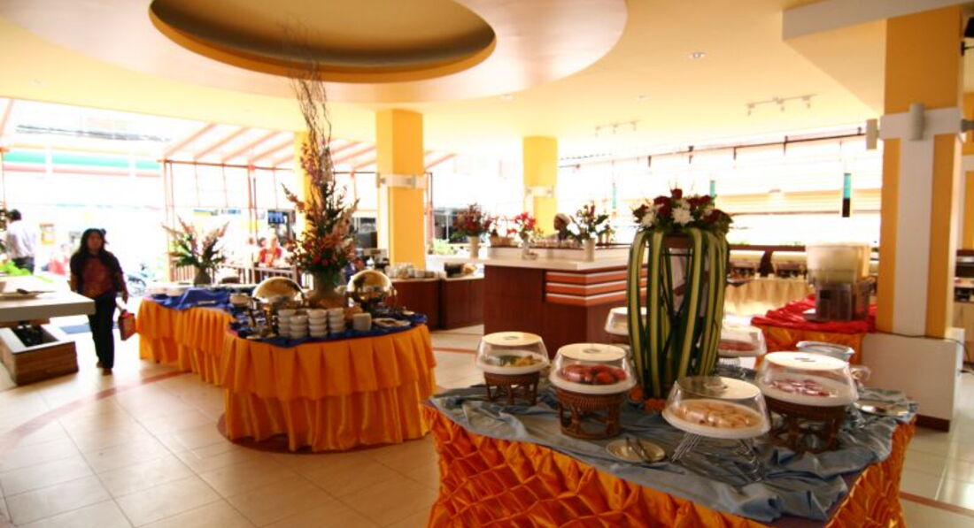 Отель соответствует трем звездам. номер дали на третьем этаже вид был на стену другого отеля и кусочек моря. Сначала просили, что бы номер поменяли (так как в агентстве сказали, что номер с видом на бассейн), но нам его не дали, сказали только люкс и доплата за 500 батт за ночь. В общем остались в этом номере и в последующем не пожалели, так как у нас не очень было слышно как грохочет музыка, ну или мы так уставали, что не слышали. Мебель в номере старовата, но все чистенько. Стол, телевизор(один русский канал Россия), стул, шкаф и сейф. Фена, чайника нет (мы брали с собой). Завтраки: Когда читала отзывы думала, что люди оговаривают, что там надо для завтрака? но когда увидела, то поняла, есть не чего. все 10 дней ела тост с вареньем, без масло(оно воняет), чай, фрукты(арбуз, дыня, папая) и иногда сосиски. Нет сыра вообще не в каком виде, глазунья постоянно холодная, омлета нет. Есть картошка, вермишель, помидор, огурец, трава и какая то жидкость типа супа. Вот и весь завтрак.