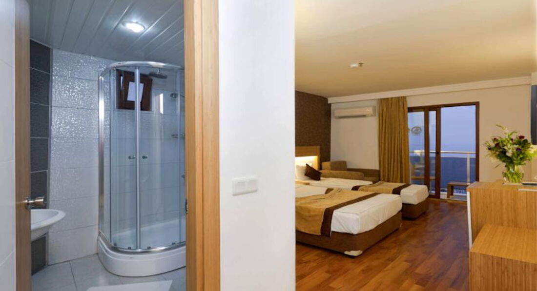 хорош, а вид из номера вечером был просто шикарный, вся Аланья так и светится. В номере есть кондиционер, душ,