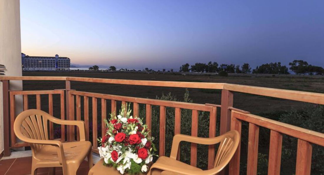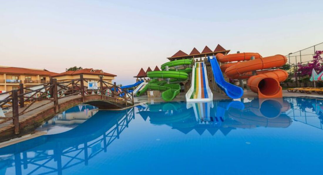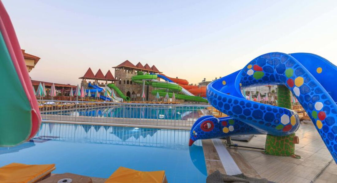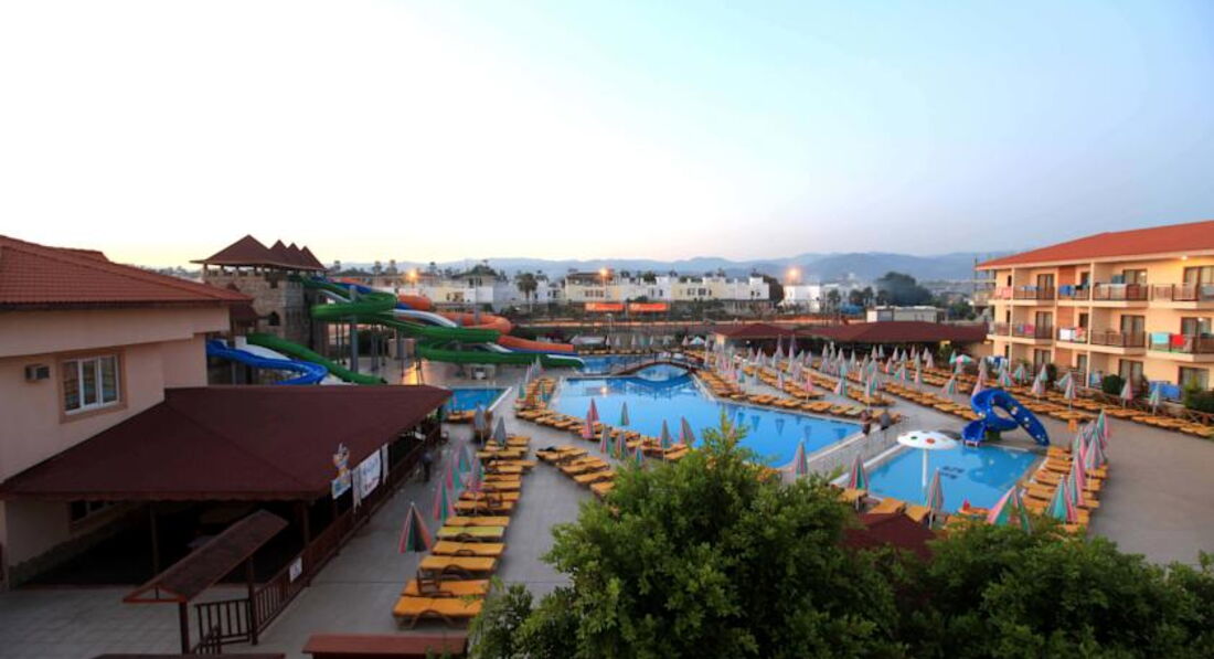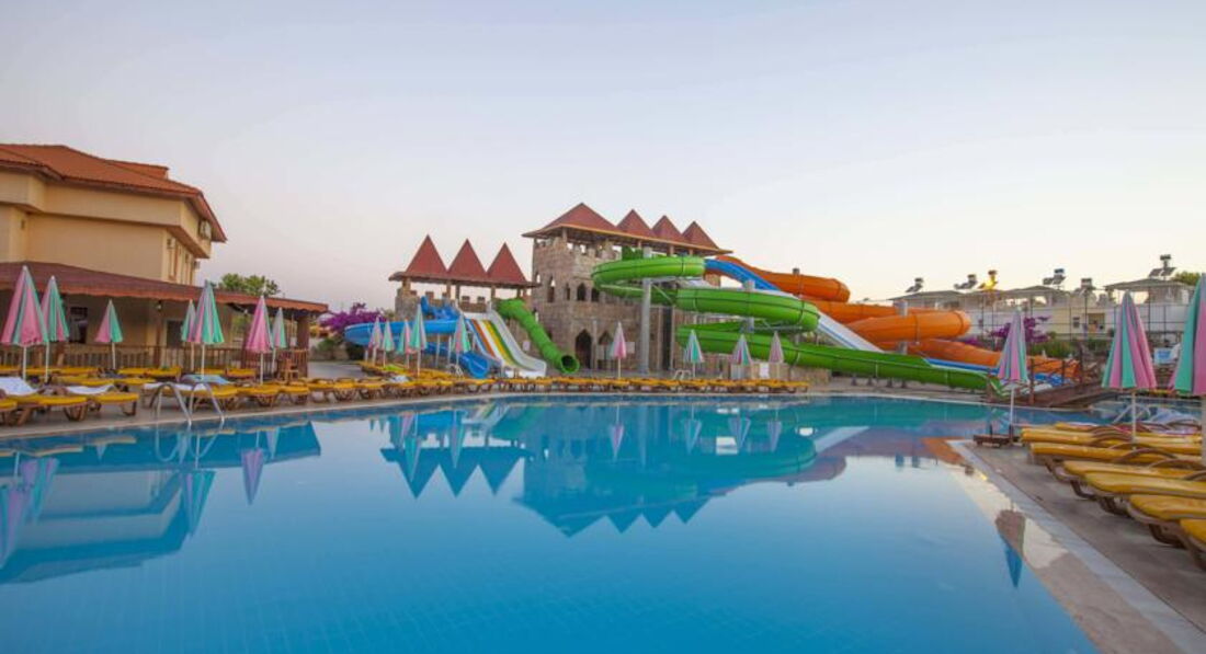 Отдыхали с сыном (11 лет) с 29 мая по 7 июня. Отель очень понравился. Все супер. Заселили (хотя очень боялись, что будут перевозить в другие отели) без проблем. Номер был на 3 этаже. Питание - что душа захочет. Сын - малоежка. Его проблема накормить. Даже он себе всегда находил, что поесть. Голодными никто не был. Еды везде хватает: что в отеле, что на пляже. В номерах при заселении в холодильнике соки и воды. В последующем меняют только воду. Очень понравился турецкий чай. Когда собирались в отель - смотрела отзывы - нигде ничего не сказано про полотенца. Мы брали свои - оказалось зря. В день заселения подошли в район бани - со слов выдали полотенца и в дальнейшем по их количеству при сдаче выдавали карточки. В номерах фен, телевизор (русских 2 канала), сейф (платный), были теплые пледы. В прибрежной зоне множество развлечений: и аквапарки, и бассейны с различными увеселительными мероприятиями и разной глубиной ( там и аниматоры и водный футбол), для маленьких детей отдельные бассейны, множество бесплатных турецких блюд: сладкие вафли, пиццы, куриные ножки в какой-то панировке, картофель фри, различные воды, мороженое, что-то типа бургеров, и др. Некоторые отдыхающие вообще не уходили с пляжной зоны с утра до вечера. Обедали прямо там. Хотя на середину дня лучше уходить - многие обгорают. Не спасают даже крема. Тем более, что наши соотечественники приезжают не подготовленными к такому солнцу из-за погодных условий этого года. У нас была проблема не от солнца, а от воды в бассейне аквапарка. Мы брали с собой аптечку с различными лекарствами. Об этом нас предупреждали. Но от аллергии я ничего не брала. Нам говорили, что в их бассейнах не используют хлорку. Оказывается используют. Иногда в вечернее время проходя мимо бассейна (с горками) чувствовался запах. У сына зачесалась грудь. Зуд очень сильный, промучились полтора дня, потом пошли в аптеку (через поле - торговые ряды и аптека там тоже есть). Фармацевт лет 45 мужчина (там их 2 - тот, что лысенький). Говорит по русски, понимает проблемы с чем обращаются, выписывает и сам делает "болтушки". В очереди его хвалили наши заболевшие отдыхающие. Мы купили там гель и таблетки. Расплачивались рублями. Обошлось в 350руб. 1 раз выпили таблетку и раза 3-4 помазались гелем - все прошло. Но если бы знала, что такое может случиться - взяла бы из дома "супрастин". Оказывается такая проблема была не только у моего сына. Многие дети чесались, только в разных местах тела (по разговорам на берегу с другими отдыхающими). Вообще - отдых это не испортило. Отдохнули просто супер!!! Сейчас по прошествии почти месяца оба хотим снова в этот же отель. По вторникам там День Турции. По воскресеньям - приезжает выездной базар. На этом базаре можно все купить дешевле, чем в торговых рядах (про которые писала ранее). Из минусов - не очень хорошая уборка в номере. Шампунь и мыло за 10 дней вообще не менялось и не добавляла уборщица. На уборку приходила часто в обеденное время, когда мы находились в номере. Наш шоколад всегда забирала, даже если не убиралась, но мыло и шампунь от этого не появлялись. И полотенца меняла как-то скупо. Под ноги вообще ни разу не добавляла полотенце, хотя при заселении она имелось. А в других домиках наоборот все было очень хорошо. Рядом в домике отдыхали наши родственники. Так они уборщицу свою вообще не наблюдали, всегда поменяны полотен