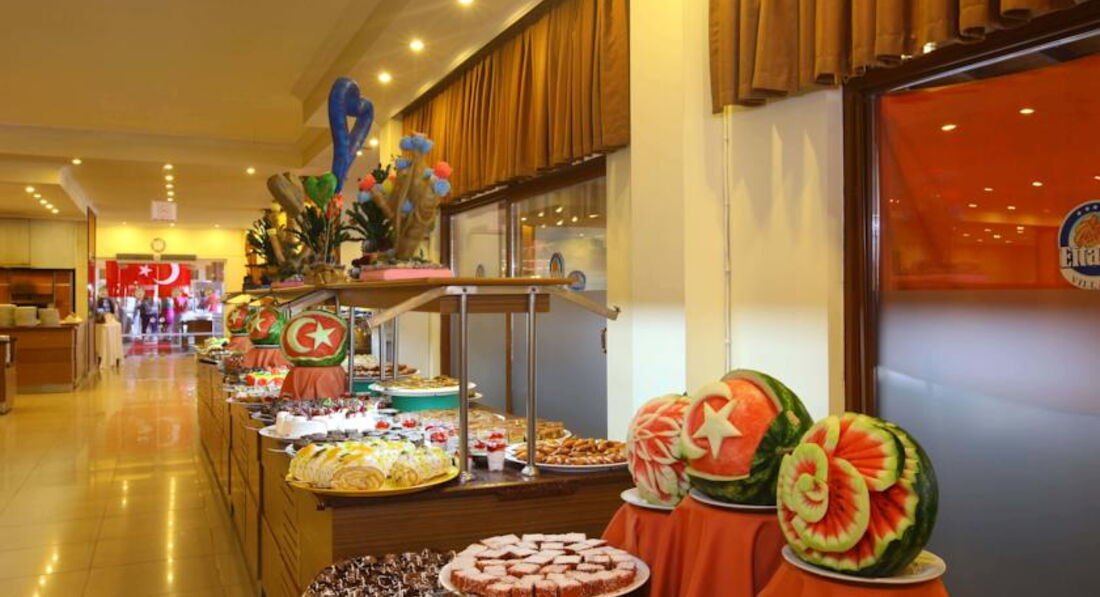 Бари та ресторани: головний ресторан розрахований на 1600 осіб (критий, літня тераса, дитяче меню, дитячі стільці), бар на пляжі (11:00-17:00), бар біля басейну (10:00-00:00), лобі -бар (10:00-00:00), диско-бар (23:30-02:00, платно), аква-бар (10:00-17:00). 2 ресторани A la Carte: османська, італійська – безкоштовно 1 раз за весь час проживання.