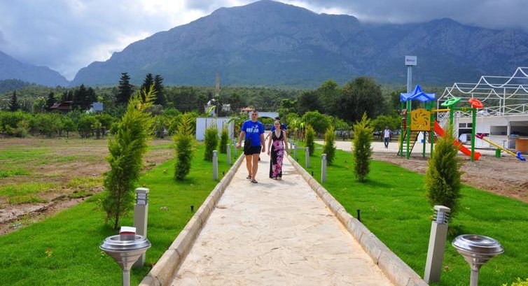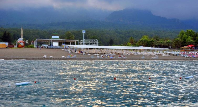 Дорога к морю занимала 5 минут прогулочным шагом. Из отеля нужно было переходить дорогу, а правила движения в Турции никто не соблюдает, так что осторожней. Где начинался пляж отеля, там по правую руку стояли домики бунгало и по левую руку небольшая детская площадка. Пляж не маленький, лежаков много, места всем хватало. Мы приходили до 9 утра и занимали первую линию у моря, вот это красота! Основной народ подтягивался к 10 утра, все приехали спать, видимо . Пляж галька, не очень чистый, хотелось бы обратить на это внимание представителей отеля! Пляж нужно чистить! Вход в море крупные камни, выходить из моря несколько не удобно, но мы все равно без обуви купались. Море шикарное! Просто шикарное! Чистое, прозрачное, ласковой, манящее, завораживающее (могу продолжать долго). Быстрая глубина (как я люблю). Вид из моря – глаз не оторвать – на шикарнейшие, красивые и величественные горы! Можно было долго плавать возле буйков и наслаждаться пейзажем. Море для мая нормальное – 21-22 градуса, в жару (как была у нас) плавать отлично!