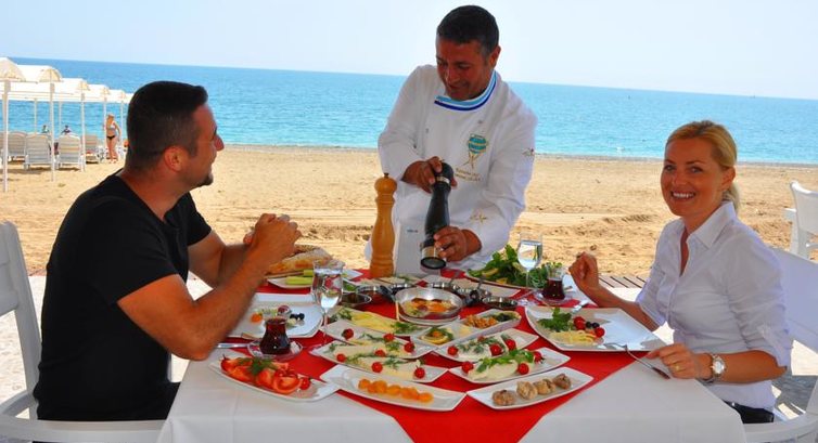 Еда в отеле обычная, как везде в Турции, но, конечно, с 5*не сравнить, выбор скуднее. Мало мяса, мало фруктов (яблоки, апельсины и грейпфруты), мало помидор (точнее их очень быстро разбирали, они очень вкусные). Но голодными никто не был, всегда находили что поесть. Курица всегда была, несколько раз на ужин рыба, что-то готовили на гриле. Приличные супы на все приемы пищи. Пиво, вино (бутылочное красное и белое), водка, раки и др. местные напитки давали в баре. Подходи сколько хочешь, обычно очереди нет. На завтрак всегда омлет, яйца, каша, шпинат (!), много видов варенья и арахисовая паста, иногда лукум, халва, цукаты. Автомат делал капучинно, эспрессо, кофе латте. Чай не в пакетах. С детьми было не очень много народу, но, на мой взгляд, питания для детей там нет. Где-то в период 10-12 мая было большое заселение и это отразилось на очередях в ресторане.