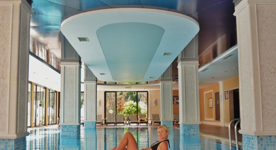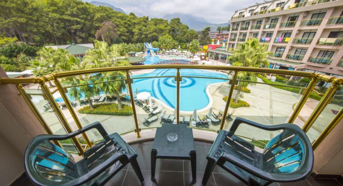 -- территория отеля красивая, вся в цветах, горы, сосны… Очистные сооружения нас не беспокоили. Большой бассейн, две водные горки (с синей лучше не кататься, мы порвали плавки). Хорошая детская площадка. Отличные бани. Есть тренажерный зал.