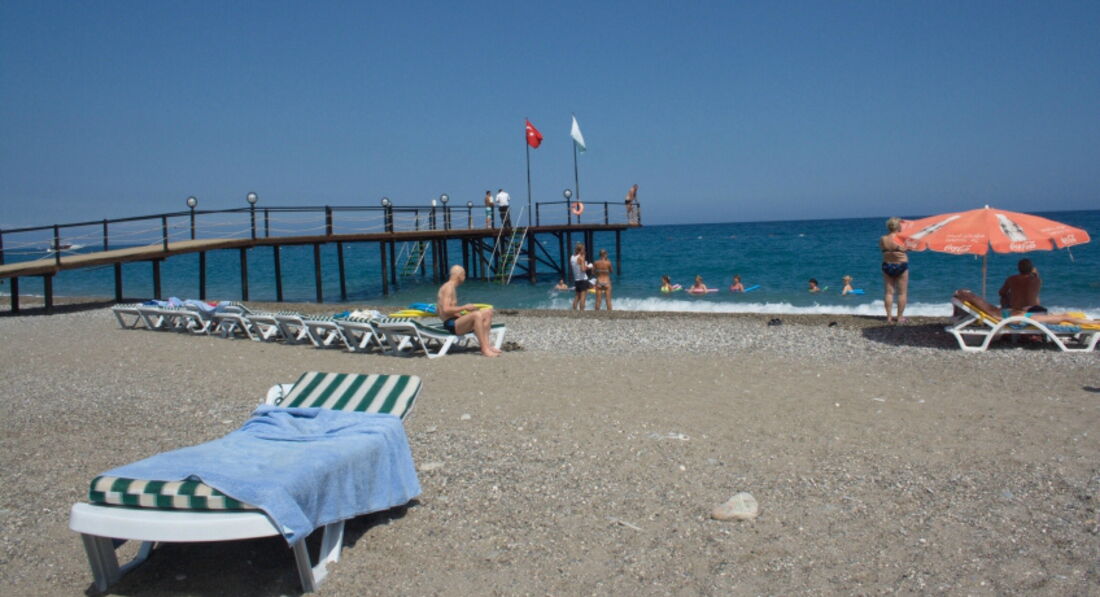 Пляж у отеля собственный, действительно не хватает бара на пляже. Лежаки (по крайней мере нам попадались) не сломанные. Заход в море - галька. В это время море теплейшее, как молоко. Мы часами в нём барахтались. Прыгали с пирса отеля Zena, когда охранник гулял :)