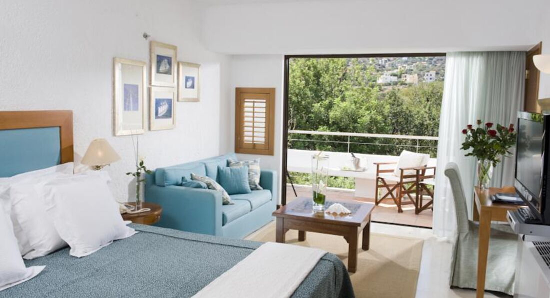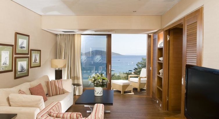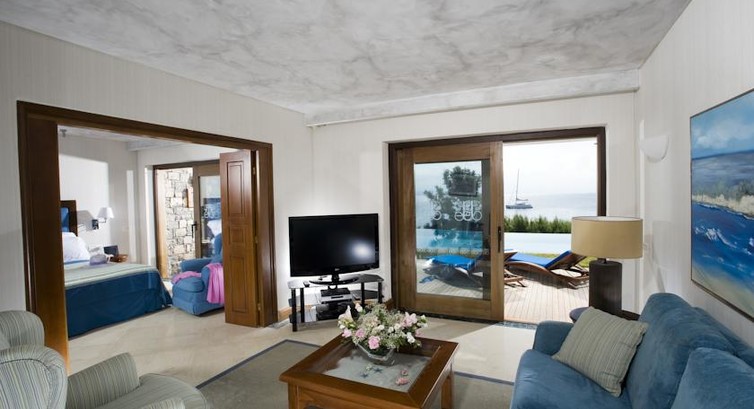• One bedroom luxury suite front sea view with shared heated pool (прямий вид на море, спальня з зоною вітальні, осн. ліжко – двоспальне (2 односпальні за запитом), додатковий – диван-ліжко, ванна кімната з джакузі, спільний басейн, макс.2+1 чол., 50 м2),