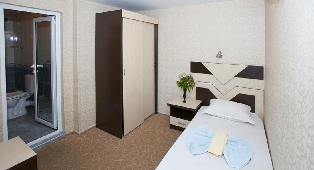 Добирались в болгарию прямым автобусом из Кривого Рога. Компания Ильтур в этом отношении справилась на все 150%, идеальный трансфер, все без задержек - 25 часов и возле отеля в 15-00. В отели регистрация заняла 5 минут. Отель небольшой, поселили на 2 этаже с видом во двор, номер стандартный небольшой, картинки есть в предидущих отзывах. Дополнительная кровать была раскладным креслом, а так как ребенок у меня высокий было ему не удобно, попросили заменить на что-то другое, пока сходили на море - уже заменили на раскладную кровать с матрацом. Сервис отличный - убирали каждый день очень качественно, полотенца заменяли через 3 дня, постели через 7 дней. Мебель простая но все свежее. Вода горячая была всегда. Отзывчивая хозяйка Эльвира, деньги меняли на рецепшен, курс в курортный городах одинаков (100 евро - 191 лев)