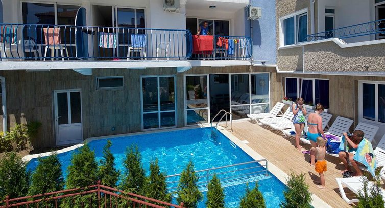 Имели счастье отдыхать в этом отеле в августе 2013 года. Начнем попорядку. По приезду нас встретила улыбчивая женщина которая сразу же нас оформила, а во время оформления все время с улыбкой отвечала на все наши вопросы. Очень удобно кстати прям на рецепшн можно обменять деньги, причем курс такой же как и в обмениках, но тут вы можете обменять на купюры любого номинала. Номер находился наш на втором этаже (что потом как выяснилось очень удобно так как сигнал wi-fi доставал до нашего балкона. Номер был чистый и регулярно убирался. Огромнейшая кровать, холодильник, телевизор, душ с постоянной горячей водой все было. Отель маленький, уютный)) есть бильярд в кафе. кстати само кафе хорошее, кормили вкусно, разнообразно и главное всегда всего хватало. так же есть свой магазинчик, но мы ходили в супермаркет лидл что на трасе, там дешевле та и выбор больше. Сама Равда маленькое поселение в котором почти все строения это подобные отельчики. Пляжей два, мы ходили на центральный, но нам не повезло был шторм и после него три дня весь берег был усеян водорослями. Из развлечений имеется куча кафешек а также велеколепный аквапарк, в него можно дойти пешком или бесплатным автобусом. Ну и конечно же это Несебр!!!! потрясающий город три раза туда ездили и три раза проподали на день)) Вобщем нам понравилось. Ах да и самое главное нет ни комаров ни мух ни муравьев!! Так что кого интересует недорогой семейный отдых рекомендую этот отельчик.