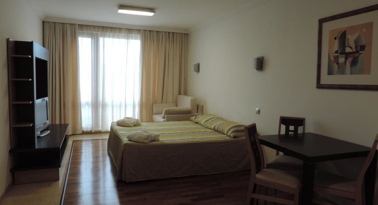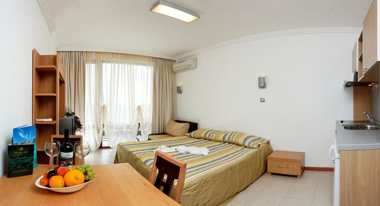 Мы останавливались в студио-апартаментах. Следует отметить, что несмотря на одинаковую стоимость предлагаемые студио очень сильно отличаются друг от друга. Прежде всего, размерами. В первый наш приезд нас поселили в Дамаск в довольно просторный номер с большой двуспальной кроватью, раскладным креслом и прочим, одинаковым для всех номеров-студио содержанием (обеденный стол со стульями, телевизор, кухонный уголок). Во второй раз нам предложили номер в Эмеральде раза в полтора меньше, почти все пространство которого было занято двуспальной кроватью. Только после претензий на ресепшн нам дали номер нормального размера в корпусе Икат.