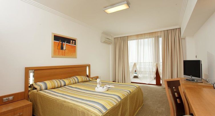 Добавлю отрицательную эмоцию на счет пляжа. Идти на пляж нужно через какую-то "зону отчуждения" между отелем и морем. Комплект "2 лежака + зонтик" стоит 11 лев (примерно 220 рублей) в день. Пляж крохотный, на 1 кв м по человеку, в море зайти невозможно - тесно. Очень жаль мамашек с маленькими детьми, т.к. комфорта никакого... все очень напоминает сочинский городской пляж.