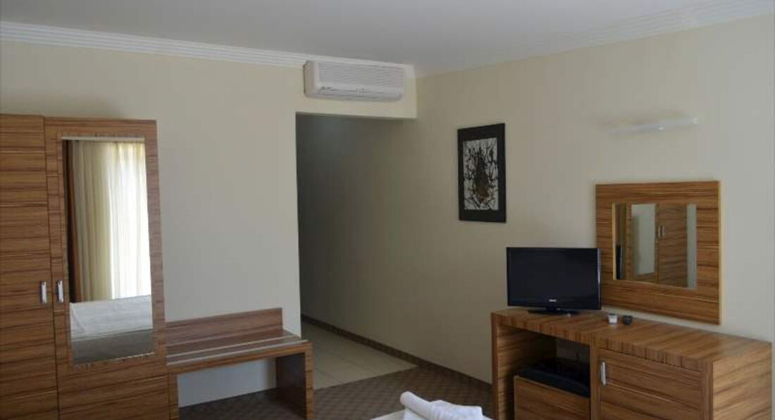 Ужас. Это не 4 звезды. Максимум 2. В номере нет даже шкафа. Слив с душа идет напрямую в стояк и живешь в деревенском сортире по-запаху. Настольный теннис, бильярд, дартс – это большая сказка. От бильярда остался раздолбанный стол, который используют, как подставку под упаковки с водой. Спортзал – это далекая мечта. Как и закрыта обещанная детская площадка. При въезде внаглую требуют 20 долларов за сутки за приличный номер, потом соглашаются на 50 за все время. Но приличных номеров всего штук 10. Если они заняты, то и деньги не помогут. Две трети постояльцев – турки и их дети. Так что бассейн оккупирован весь день. Детский бассейн с реально грязной водой. Возле лежаков муравьи. Пляжных полотенец не существует. На море лежаков хватает только двум третям – места занимают с пяти утра. В море навален крупный скользкий булыжник – встречаются люди с перебинтованными ногами, одного встретил с гипсом на руке. Турки люди первого сорта, русскоговорящие - второго. Персонал не знает ни русского, ни английского. Из униформы заношенные футболки и пляжные шорты. Столы везде грязные, как и посуда. С едой полный абзац. Все немного съедобное сметается толпой за три минуты и продолжения нет. Яичницу пожарить или блины – они не умеют. Из еды готовьтесь получать вареные яйца утром и разок в 2-3 дня немного курицы, если успеете взять. Вилок на всех не хватает, стаканчики разовые из самого тонкого целлофана. В баре стоит копилка «на чай» и тоже клянчат деньги. И бар один – возле бассейна. Про два бара – это сказка. Бармен такой, что кажется, что ты ему сильно должен по-жизни, а когда он шевелится – это он делает большое одолжение. Что такое коктейль он не знает. Все рецепты – виски-кола, джин-спрайт и т.д. Если просишь смешать что-то другое, отказывает сразу. Хотя при самом низком качестве барного спиртного, лучше привезти с собой. Со столов у бара и бассейна убрать пустые стаканчики – это часа через 2. Пепельницы вытряхиваются через одну раз в сутки. Муравьи везде. Музыка, в основном, арабо-турецкая. Хоть они и берут музыку через Интернет, просить что-то другое бесполезно. Так что на вечерних танцульках только залитые шмурдюком местного разлива – человек 10. При въезде присутствует один на весь отель русскоговорящий турок и начинает прием гостей с просьбы попробовать русскую сигарету. Решить вопрос в ресепшен невозможно, или готовьте 20-50 долларов за элементарное телодвижение. У соседа попросили доллар за показать, где ресторан. Хотя это не ресторан, а советская столовая при хреновом заведующем. И вот по этой столовой, когда мало людей, бродит реально лишайная кошка. Грязную посуду убирают со столов очень долго, так что сидишь за столом, а рядом чужие грязные тарелки с объедками, ну и загаженный стол, как и у бара – на столе чужие грязные стаканчики и грязный стол. Полотенец при въезде в номере нет. День-два потратите на их выклянчивание. Если не вопить пару часов, то уборки номера и смены белья не дождетесь за все время тура. Да и у уборщицы не от всех номеров есть ключ. Ремонта в отеле не было лет 20. Розетки вываливаются, наличники не везде, занавесок в душах нет, светильников половина не горит. Перед балконом первого (по-нашему второго) этажа площадка – вся засыпана окурками с верхних этажей, сгнившими носками и какими то тампонами. Телевизор древний – сантиметров 30 по диагона