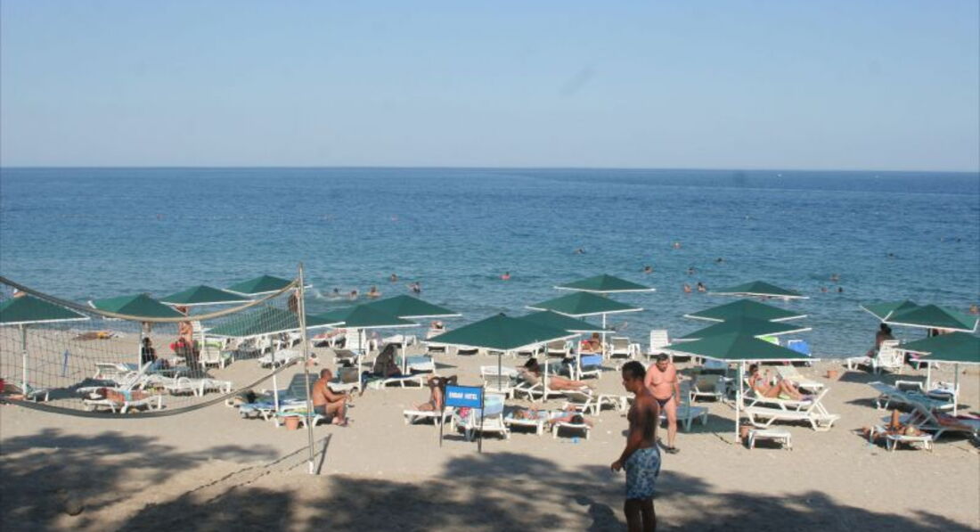 На пляже лежаков хватало,море чистое,теплое!правда камни немножко напрягали.тент на пляже из соломы,которая во время ветра падала нам на голову!в итоге 20 сентября эту оставшуюся солому всю убрали.