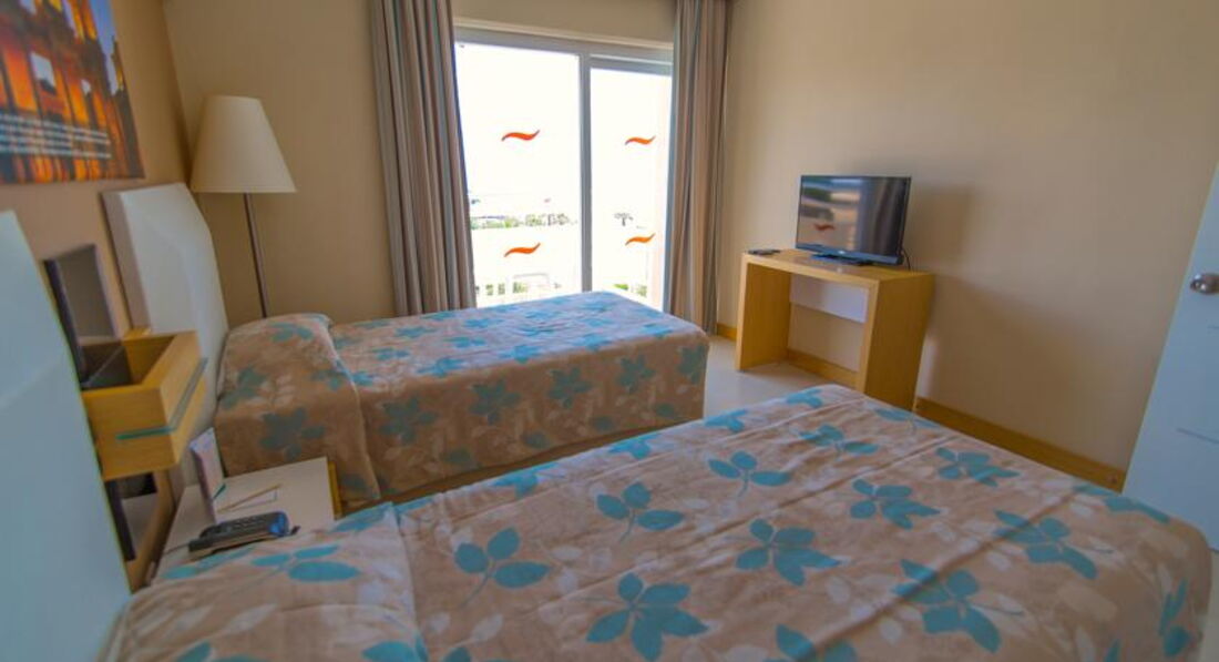 Номер отличный!!!, никаких претензий, кроме того, что один раз за 12 дней были недолгие перебои с электричеством, но мастер пришёл сразу и всё исправил. Вид из номера очень красивый - справа на море и бассейн, внизу на вечерний ресторан и впереди на территорию соседнего отеля Сенсинос. В номере балкон с горизонтальными металлическими перилами, можно повесить верёвку для сушки белья)), пластиковыми креслами и столиком. Ещё в номере шкаф с вешалками и сейфом (за доп. плату), полки под чемоданы, зеркало, ТВ - панель среднего размера, мини-холодильник, кондиционер, кресло, тумбочки и кровати (мы заранее просили две, так что прямо под заказ). Главное, что всё работало и не ломалось! Совмещённый санузел с ванной. Из косметики было всё, кроме геля для душа и лосьона для тела, пришлось докупать в центре города. Ключ от номера - карточка.