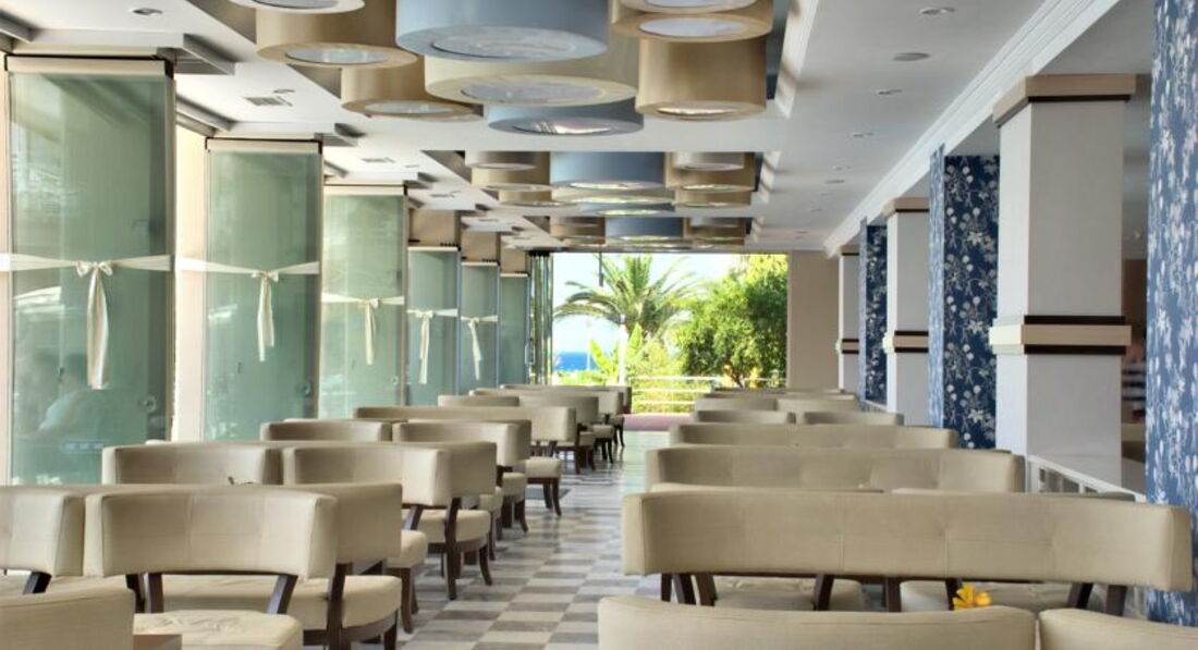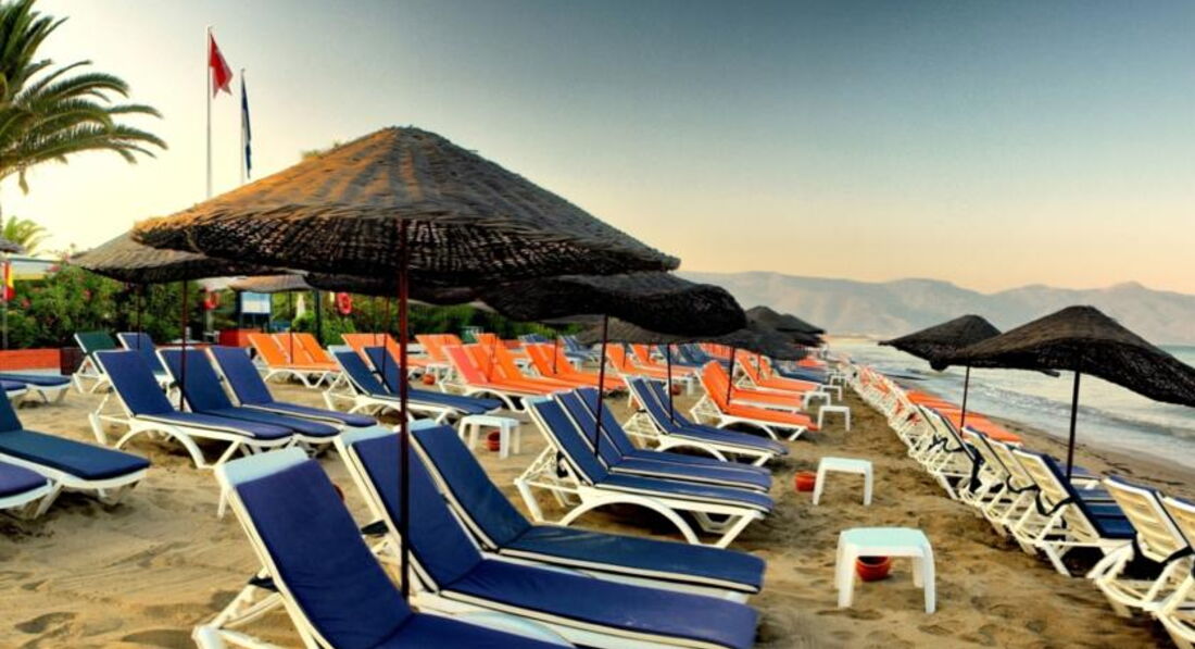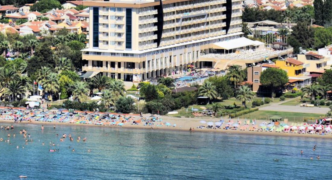 Отдыхали семьёй в начале июля 2009г. Отель всем понравился, свои 4 звезды полностью оправдывает. Расположен в тихом районе «Лонг Бич» города Кушадасы. Рядом находятся только отели и виллы. Для любителей «шопинга» добраться до центра города нет особых проблем (15 минут), постоянно ходит маршрутное такси (4,5 лиры). До моря от отеля метров 50—70. На пляже всё, что надо, бесплатно (пляжные полотенца выдаются в отеле по карточкам, меняются по вашему желанию, хоть два раза в день). Один из 4-х баров (работают до 24.00) от пляжа в 10 метрах. Мест на пляже в принципе всем хватает. Сразу же за пляжем на территории имеется небольшой пальмовый парк с газоном, где также имеются шезлонги, зонтики и матрасы, но там занимают место немцы уже в 6 утра. Зонтики на пляже плетёные из лозы, очень хорошо под ними загорать, не сгоришь. Правда, работника пляжа надо бы поменять, парень не очень желает работать. Номера стандартные —18м2., с частичным видом на море. Мебель в номере не новая, но в приличном состоянии, на кроватях ортопедические матрасы, очень удобные. Кондиционер в номере индивидуальный, но пульт закрыт прозрачной крышкой, чтобы не регулировали, но наши люди умудрялись крышечку открутить и регулировали температуру по своему желанию. Питание в ресторанах очень хорошее, всего хватало, сразу же подносили новые порции, как только что-то начинало заканчиваться. Фруктов в наличии 3-5 видов. Вообще, питаться можно начинать в 7.00 и без перерыва до 01.00, ну это для особо голодающих, мне лично и 3-х раз было много. Минеральная вода в бутылках бесплатная, можно брать с собой. Спиртное не разведённое, бутылки открывают на глазах у посетителей, количество порции по желанию клиента. Коктейли, если желаете, приготовят и по вашему рецепту. Весь персонал очень доброжелательный, постоянно старается угодить, разницы в отношении к немцам и русскоговорящим нет вообще. Для лучшего понимания друг друга я бы посоветовал хоть малость подучить английский, во всём отеле из персонала только одна женщина русскоговорящая. Аниматоры в отеле с 10.00 до 23.00. Ребята приветливые и не пошлые. Оценка за их работу 3+. Вокруг отеля расположены посты охраны, мышь чужая не проскочит. Для семейного отдыха отель очень даже неплохой. Для молодёжи, может, будет немного скучновато, так как дискотеки только детские.
