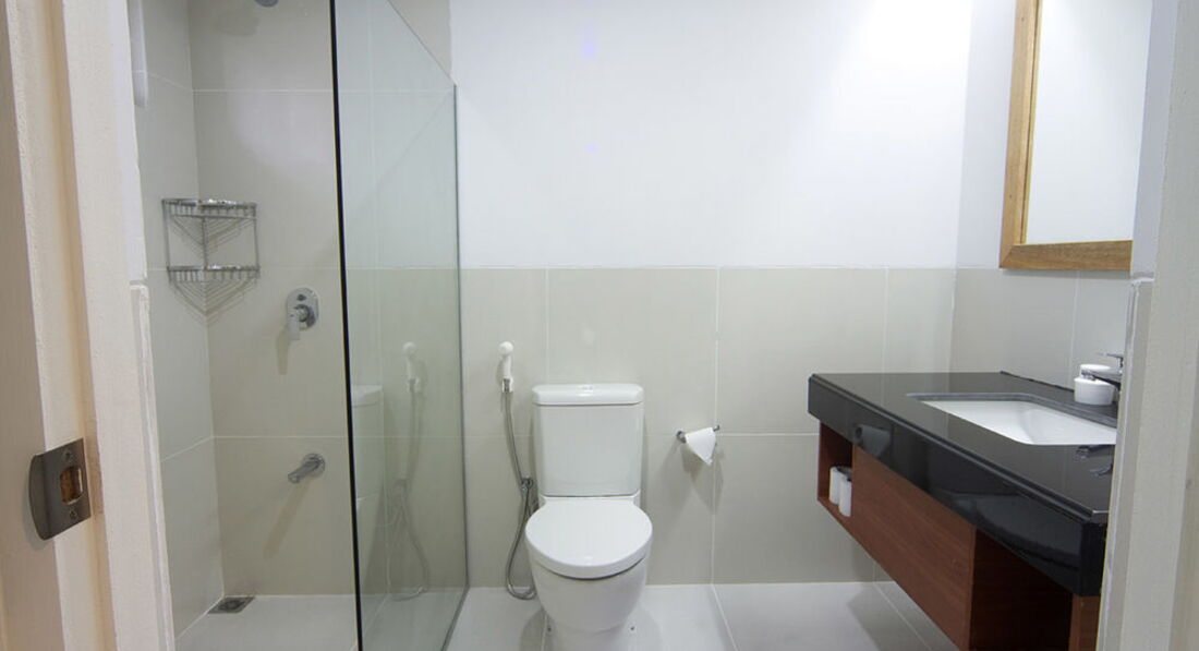 Номера чистые, комфортные. Удобная кровать, кондиционер, вентилятор, холодильник, зеркало, чайник, чашки, стаканы, сейф, шкаф с кучей плечиков, в ванной комнате есть фен. Из мыльно-рыльного только мыло. Вода мягкая, мыло не сушило кожу, я даже не пользовалась своим кремом для лица.