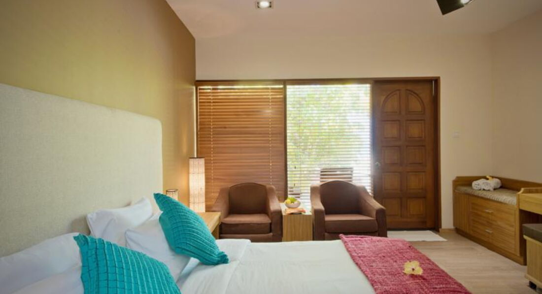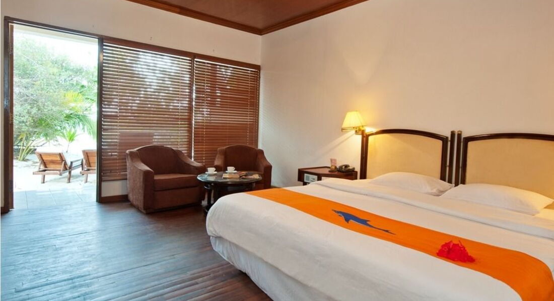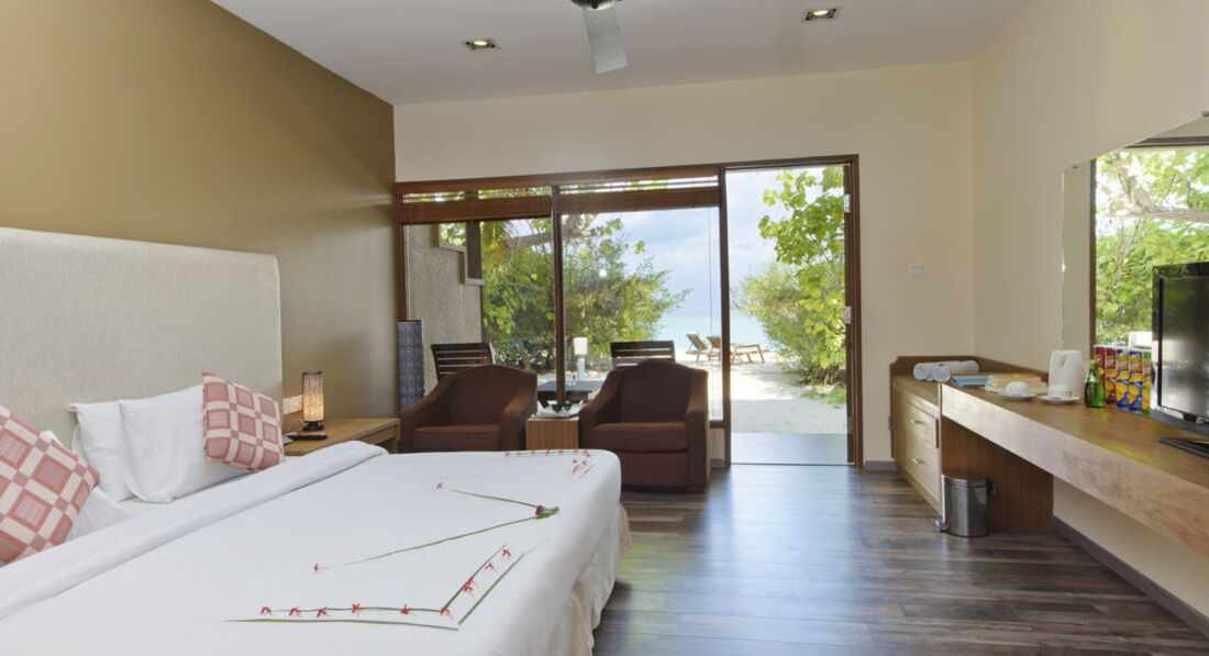 20 Deluxe Beach Bungalows (54 кв.м., Beach Front Villas знаходяться всього за кілька метрів від води, серед затінених танцюючих листя пальм, навколишніх острів. Він оснащений двоспальним ліжком, відкриті ванні кімнати з тропічним душем на відкритому повітрі та ванною, окрема веранда, подушки та пляжні рушники.),