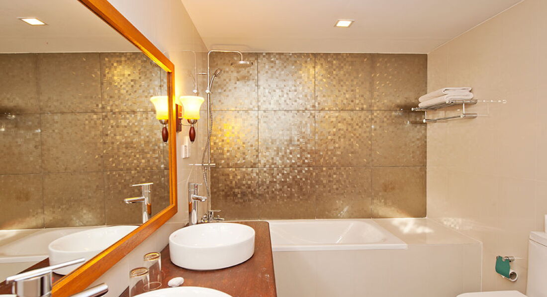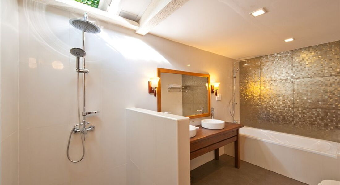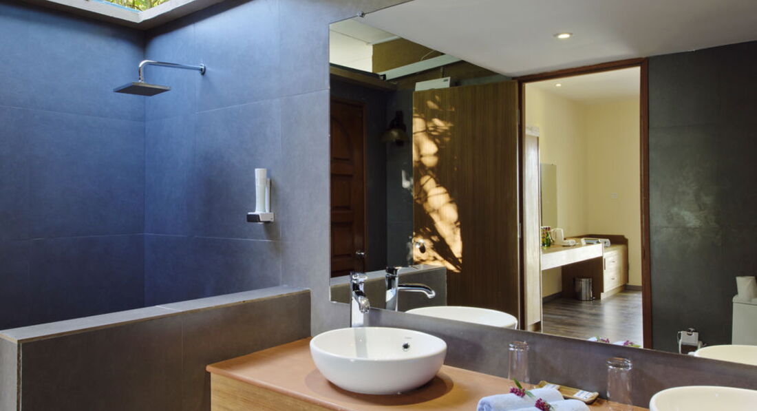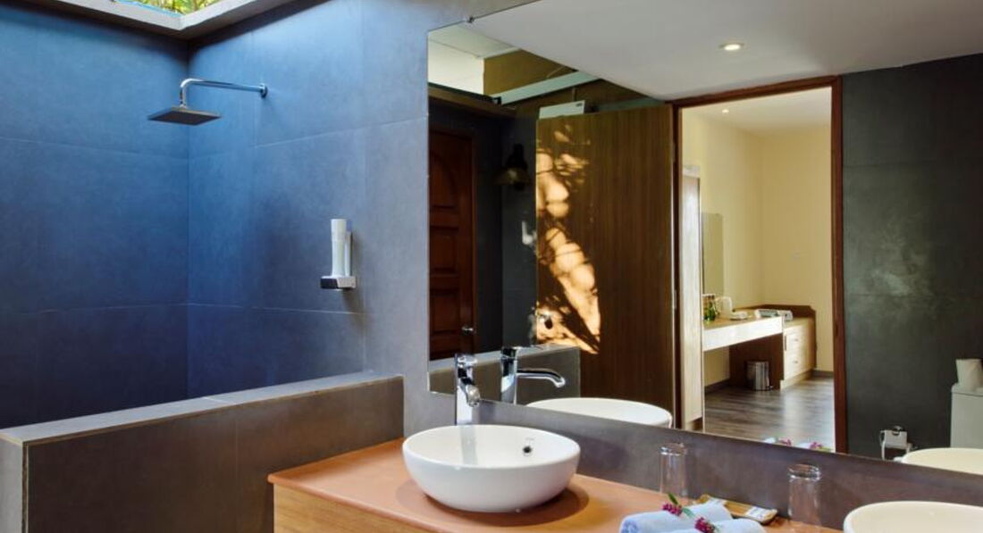 Номер хороший, больше всего мне полюбилась ванная комната с ванной, с душем под открытым небом и двумя раковинами. Но потом, когда пошли дожди этот открытый душ был не в тему- вода затекала на пол бесконтрольно, заливало прилично. Не мешало бы швабры для сгона воды оставить в номере. Но всё равно это классно. Вот только запах канализации частенько возникал, поэтому в номере стоял освежитель воздуха.А ещё, что мне понравилось- это большие хорошие пляжные полотенца, и отдельный вход в номер через ванную, около входа кран с водой-ноги ополоснул от песка и в душ сразу. Супер идея!