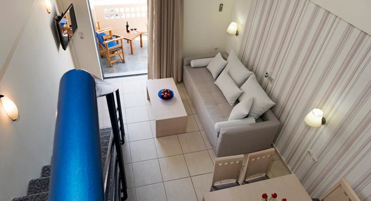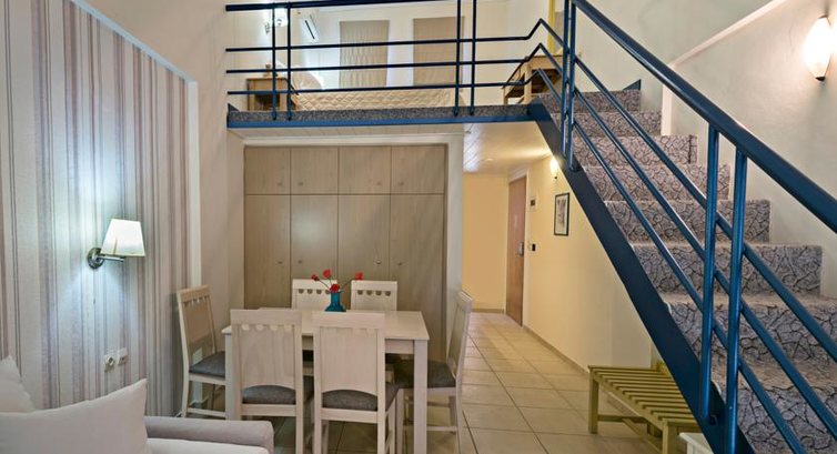 maisonette 1 bedroom (двохрівневий номер, верхній рівень – спальня, відкритого плану, осн. ліжко – двоспальне або 2 односпальні; нижній рівень – вітальня відкритого плану, дод. – 2 односпальні ліжка, 2 кондиціонери, 2 телевізори, макс. 4 чол., 28 м2),