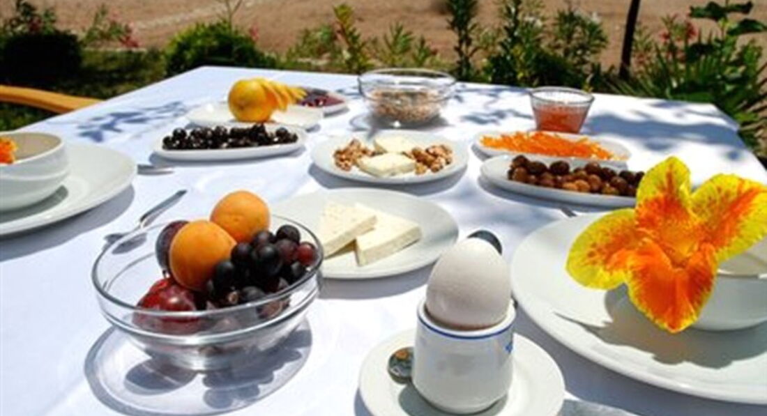 Завтраки были в соседнем отеле Valeri Beach, это недалеко 5 минут ходьбы. В первый день еда показалась разнообразной, но как обычно бывает к завершению отдыха - приелась. На завтраки обычно подавали отварные яйца, кашу или омлеты с помидорами, а так же нарезка сырная и мясная, овощи и фрукты, джемы, очень вкусная выпечка. Чай, кофе и соки.