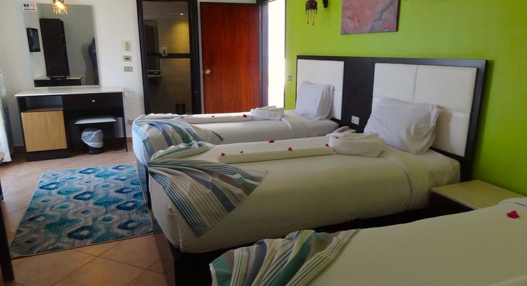 Отдыхали здесь с мамой и подругой с 1 по 10 апреля 2015 года.Заселение прошло не очень весело,так как после нашего отказа доплатить за хороший номер нас заселили в двухместный.Мы были в шоке.Ребята-носильщики пошли разбираться на ресепшн и нам дали трехместный.Территория отеля маленькая,но уютная,нам больше нравилось гулять по улочкам Наама-Бей.Кормили очень вкусно,хоть разнообразие блюд и не очень.Понравилось питание даже больше,чем в турецкой четверке.Всего хватало.Из алкоголя только пиво и крепкие напитки,вина не было.Понравилась очень самбука местного производства.Пляж далековато,минут 10 быстрым шагом,лежаки не очень новые.Экскурсии брали у торговцев фруктами- Гена и Чебурашка,как они себя называют.В два раза дешевле и качественно,брали Израиль.Аниматор Александр пытался разнообразить наш отдых,придумывая развлечения,конкурсы и экскурсии.Молодец.Особенно хотелось бы отметить администратора Ханни,супер человечище.Благодаря ему и моему ломаному английскому мы смогли сэкономить на такси и многом другом,езжа на автобусах.Он помогал нам всегда и решал многие наши проблемы.Огромное ему спасибо.В целом отдых очень понравился,душевно и тепло.