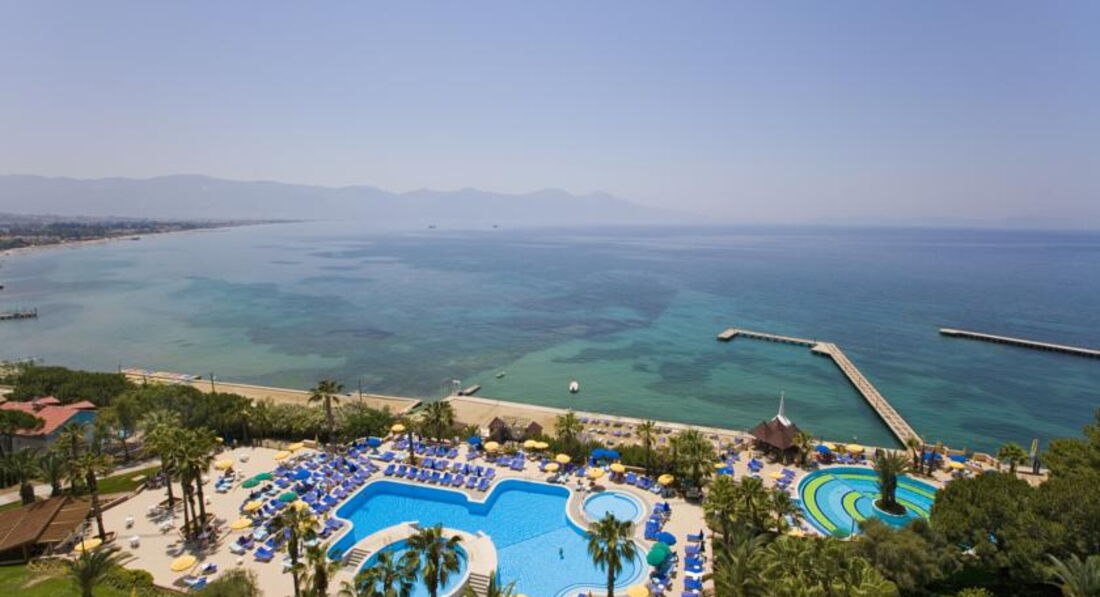 Отдыхали в этом отеле с 7 по 21 июня, с женой и двумя дочками. Выбирал отель дней за 10 по отзывам на этом сайте. Критерий был: город Кушадасы, 5 звезд, размещение 2+2, волейбол и серфинг. Как оказалось, выборать было особо нечего: где размещение максимум 2+1, где уже на месяц вперед забронировано, а где просто волейбола или серфинга нету. Встречающая фирма оказалась - ТУРБАЗАР. Особо говорить про нее нечего: встретила, привезла в отель, предложила на выбор экскурсии, отвезла в аэропорт. Единственного что не понравилось, так это маршрут авиаперелета: мы летели из Шереметьево в Бодрум, до Кушадас от него ~130 км, а вот от Измира до Кушадас ~70км - почувствуйте разницу :(