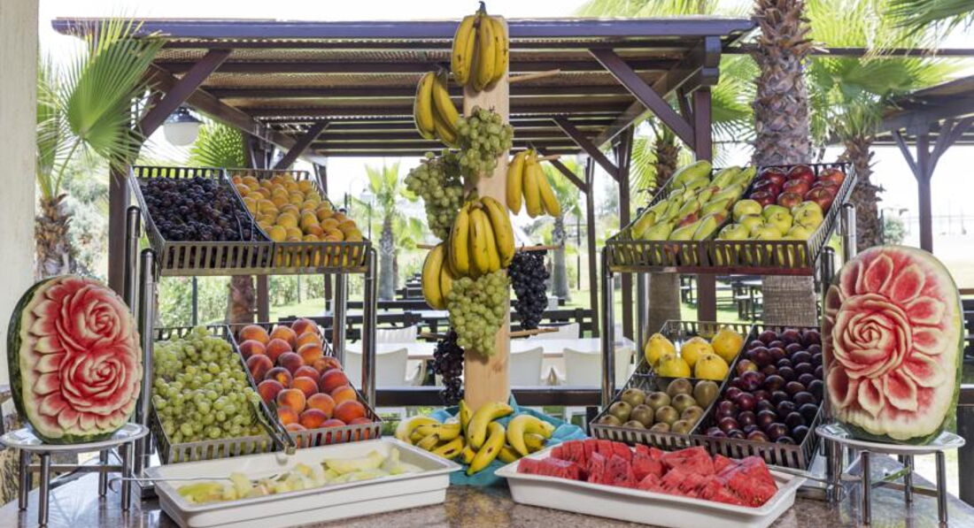 Включає: сніданок, пізній сніданок, обід, вечеря - шведський стіл; закуски протягом дня у барах готелю, алкогольні та безалкогольні напої місцевого виробництва, а також певний вибір імпортних напоїв. Морозиво (16:00-17:00) – безкоштовно, свіжі соки (07:00-10:00) – платно. Молодятам - фрукти, вино, турецькі солодощі; постійним гостям – фрукти, подарунок; іменинникам – святковий стіл.