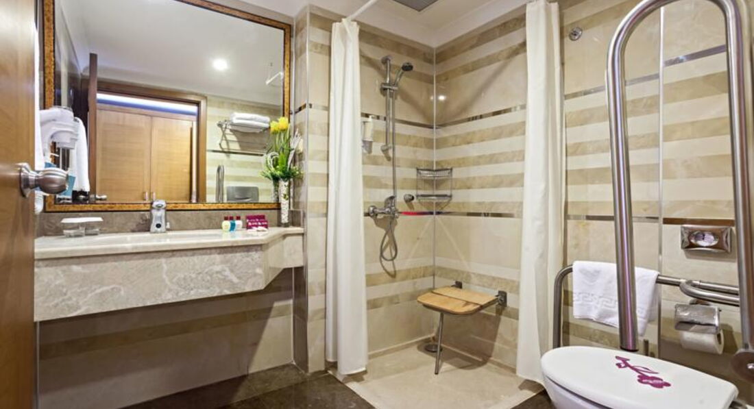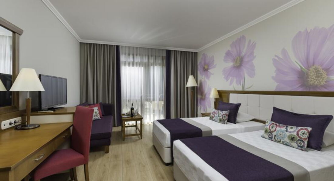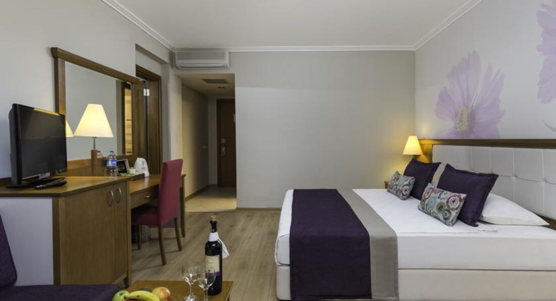 Добрый день! Отдыхали в этом отеле семьёй с ребенком 1.5 года.По прилету разместили сразу( правда мы приехали в час дня),предложили сразу пройти в ресторан покушать. В номере современный ремонт,все на месте,чайник,фен,холодильник,сейф,кондей.Поставили детскую кроватку под наш запрос. Убирали своевременно,аккуратно. Питание в отеле не очень разнообразное,ассортимент не очень большой( по сравнению с другим отелем пятеркой в Сиде), но все вкусное,свежее,особенно зелень,ни разу не отправились.Официанты вежливые.Ребёнку правда есть особо нечего было,так как он ещё не умеет жевать и диетического практически ничего не было.Баночки купить практически невозможно поблизости,так что мясные пюре везти нужно с собой.Пляж отличный,как везде в Сиде,чисто. Муж играл каждый день в волейбол,анимация нормальная,есть и русско- говорящие,нам было не до неё особо.Но понравилась детская дискотека- ребёнок танцевал.Очень понравился контактный зоопарк на территории отеля- ходили туда каждый день,мне самой было интересно пообщаться с животными.Отель очень лояльный- многие берут еду из ресторана с собой.Все устроено для детей- особенно порадовали контейнеры для использованных памперсов,детей все очень любят. Отель все- таки очень ориентирован на детей,поэтому парочкам будет может быть скучновато. Русских туристов много,примерно половина и больше. Я ходила каждый день бесплатно греться в сауну,никого в 2 часа дня там не было. Пару раз сделала массаж.Массажист Антонио- профессионал- мануальщик,но на любителя)Бассейны чистые, ребёнка купали в нем,а сами купались в море,оно похолоднее,но очень чистое приятное,с погодой очень повезло. Ходили пешком пару раз за территорию отеля на базар через дорогу,немного прикупили сувениров.Памперсы продаются в магазине на территории отеля,нам понадобились,так как наш чемодан приехал только через день.в общем впечатление от отеля и от отдыха самые положительные,рекомендую для отдыха с детьми на все 100 %,( нам его также рекомендовала наш турагент),не очень дорогой,качественный отдых.
