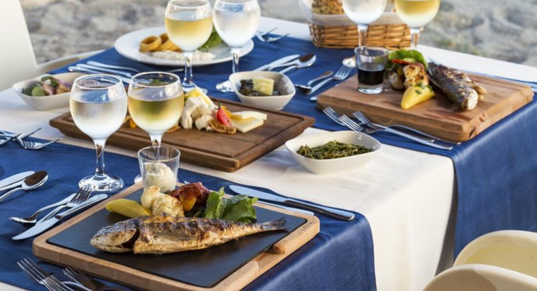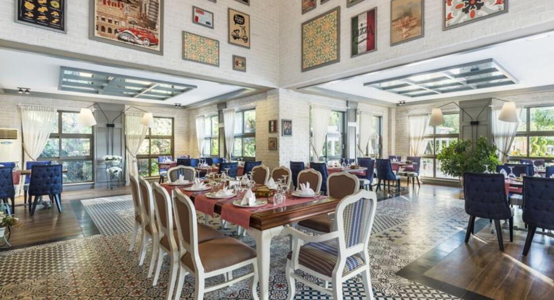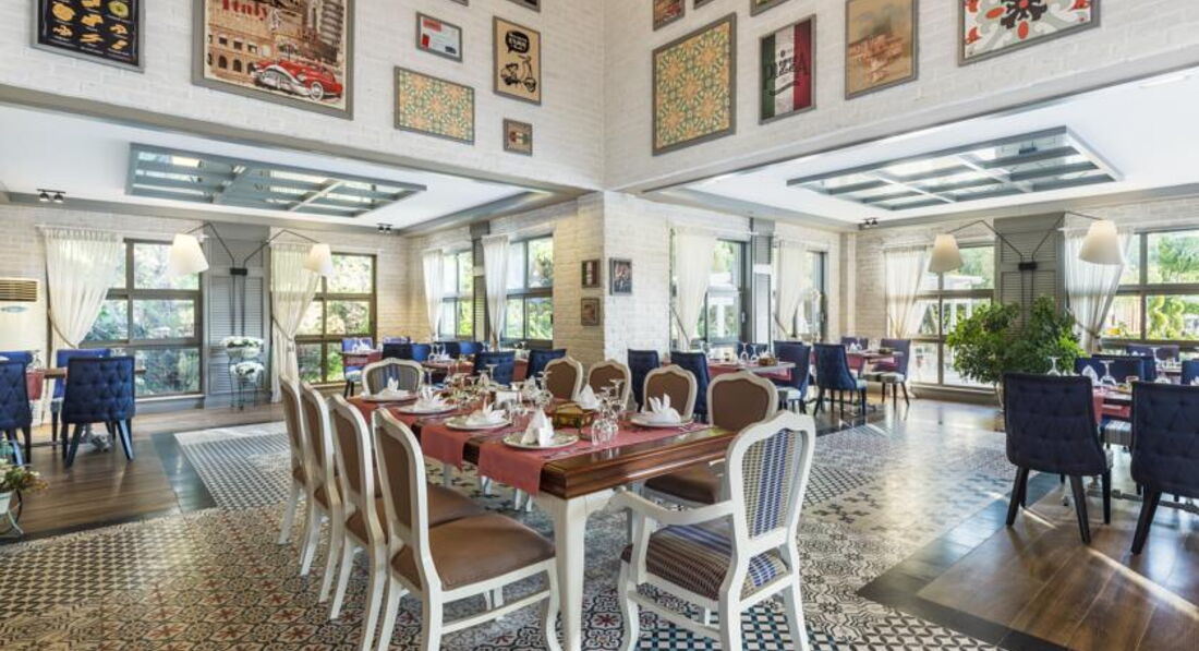Бари та ресторани: головний ресторан (критий, з кондиціонером, літня тераса, дитяче меню, дієтичне меню, дитячі стільці), бар біля басейну (10:00-24:00), бар на пляжі (10:00-18:00) , диско-бар (23:00-02:00), шоу-бар (10:00-24:00). Ресторан A la Carte: італійський – безкоштовно 1 раз на тиждень, за попередньою резервацією.