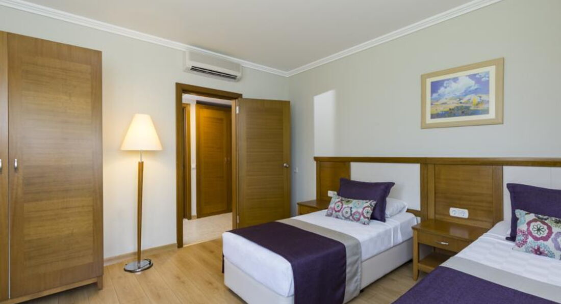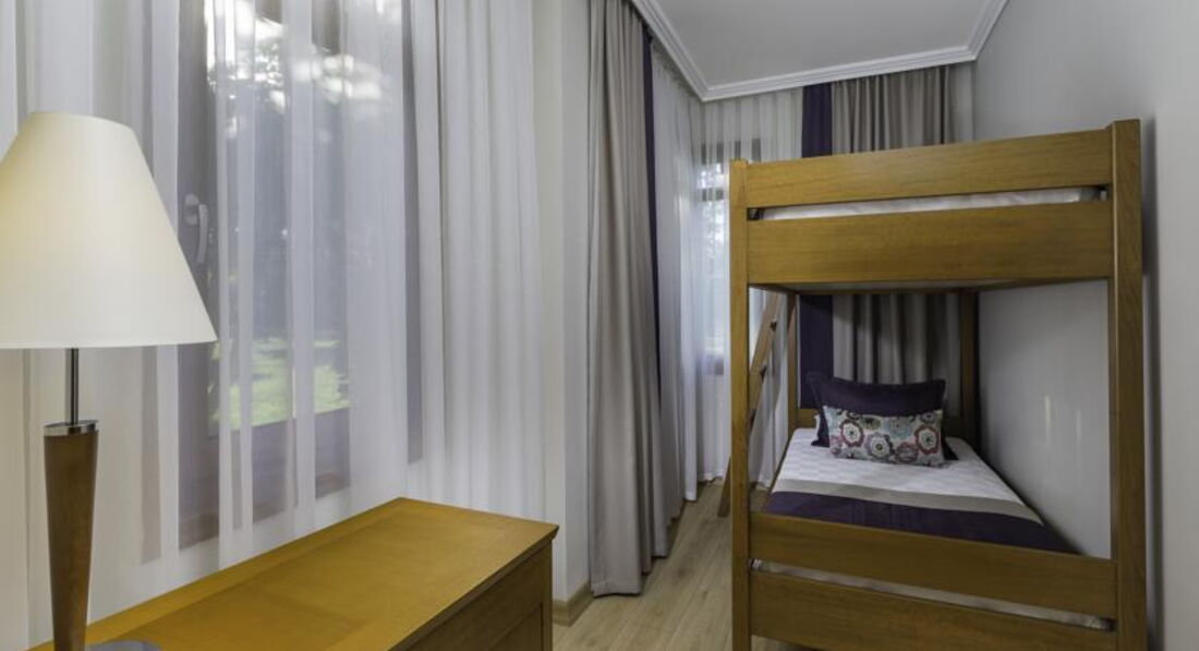 Приехали в отель до начала официального заселения, но это не помешало персоналу нас расселить. Молодой человек помог с багажом, нам быстро провели инструктаж, надели браслетики (взрослым - оранжевые, детям - зеленые) и показали номер. Сообщили, чтобы не беспокоились на счет обеда – нас в любом случае накормят. Наш номер 204 (Family Junior room) оказался без изъянов, кондиционер фунциклировал, сантехника не поломанная, окна открывались, лампочки рабочие, бесплатный сейф накрепко прикручен, холодильник холодил… В баре две бутылки воды, минералка 1л и по 200мл бутылке фанты и пепси. Мини-бар бесплатный, но его не пополняли, наверное потому, что мы за весь отпуск пили только воду и приносили с собой ее запасы не дожидаясь пополнения бара. За время отпуска три ночи включали кондиционер на обогрев и ни разу не включали на охлаждение. Выход окон из виллы, кстати, называется «Лилия» (под номером 2), на восход, солнце не палило, что будет для отдыхающих в сезон бАААльшим плюсом. В номере в коридоре и ванной уложена плитка, в комнатах - ламинат. Полы холодные, кстати. В номере телевизор с большим LCD-дисплеем, мы насчитали 95 каналов!!! Есть и русские каналы типа «РТР планета» или что-то типа того.