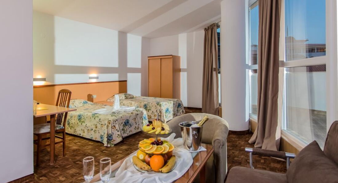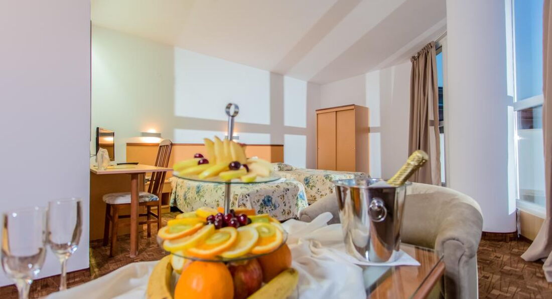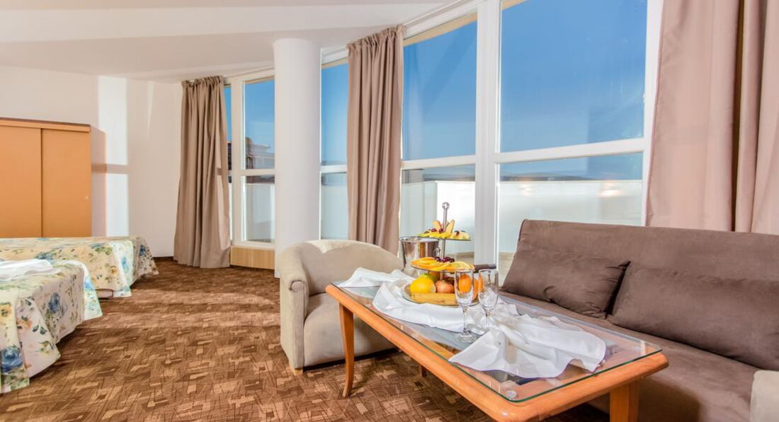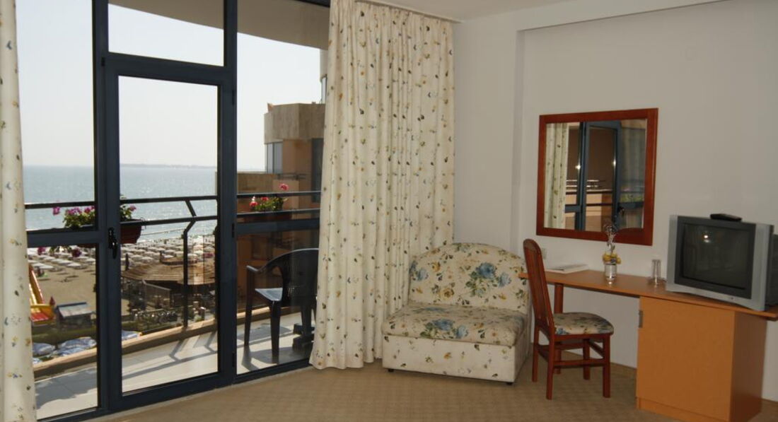 Отдыхали в этом отеле с 24.06.2015- по 4.07.2015...2 взрослых+ ребёнок (5лет)... Отель обсалютно не для отдыха с детьми,никакой детской анимации там нет,территории у отеля вообще нет,и площадки для детей нет ( всего одна горка и качелька). Есть детский уголок,3 м*3 м,девушка которая следит за детьми говорит только на болгарском и пару англ.слов знает.Отдыхали до этого в Турции,там отель 3* был уютнее и чище,чем этот. Бронировали номер bdl+ chld,с видом на море,выше 5 этаже...дали ключи,заходим,этаж 3 вид на соседний балкон,кровати раздельные и раскладушка...мы опять на ресепшин,около часа прождали,в результате заселили в номер с видом на море на 5 этаже,но кровати опять же раздельные и раскладушка 50 см шириной ( моя дочка за ночь несколько раз с неё падала, спать не удобно ужасно,одно мучение), свои кровати мы сдвинули,но матрасы все время разъезжались...