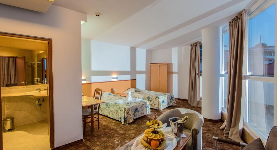 Плюс номеров. У нас был Студио – просторный однокомнатный номер 45 кв. м. (это общая площадь, включая санузел и наверное балкон). Дети играли в номере в футбол)) Для сравнения – в Болгарской Албене за эти же деньги был бы отель 3 звезды, на 3 линии в 1 км от моря (до моря ехать на автобусе), и номер Стандарт площадью 12-15 кв.м.