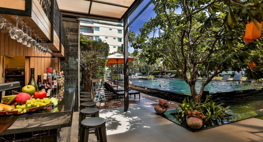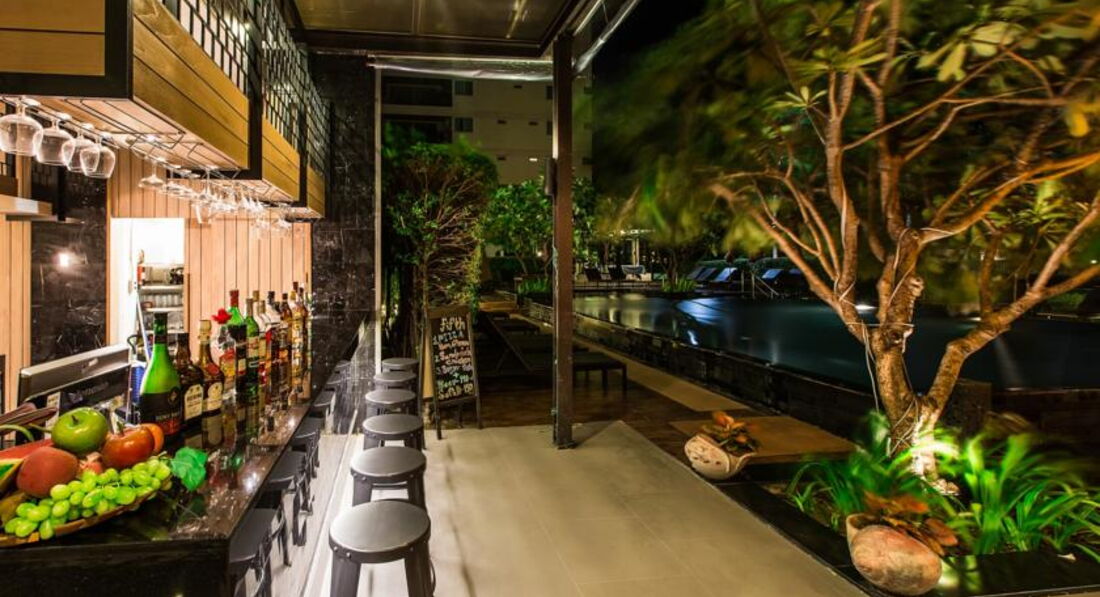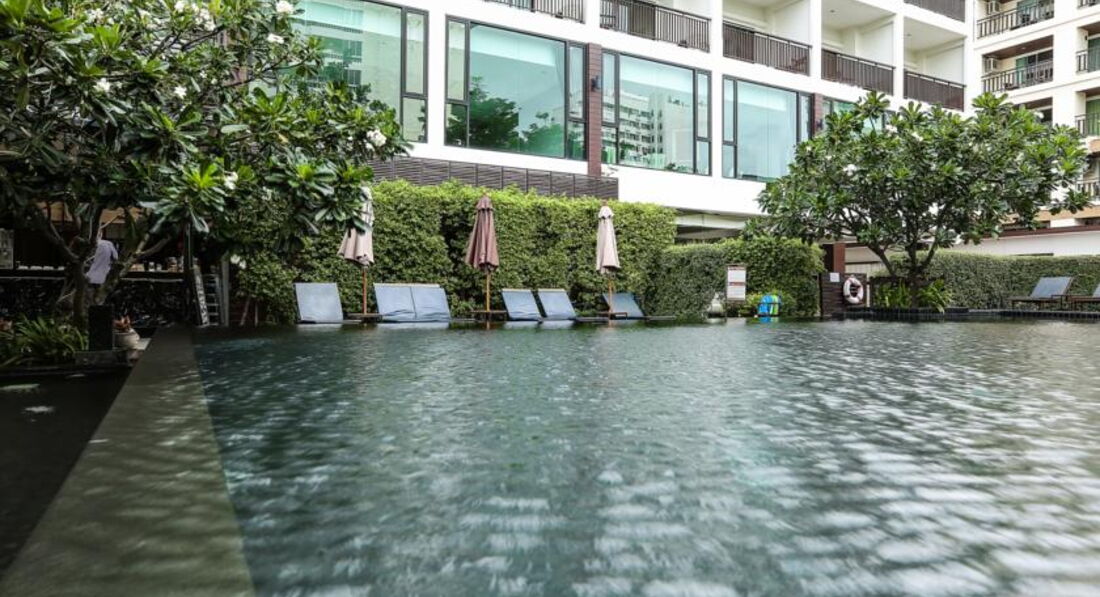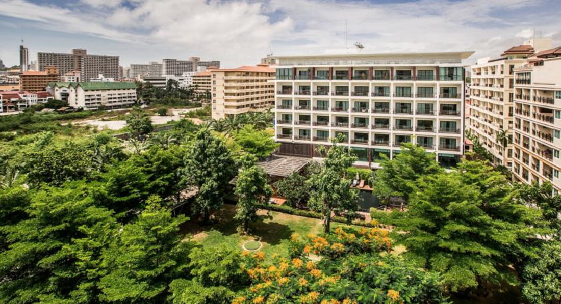 Вполне достойная резиденция для Паттайи. Заселяют быстро и приветливо. Спросили при заселении депозит в 1000 тайских бат, но у меня были только доллары, ну так и без депозита обошлись( и больше не напоминали). Стандартная комната достаточно просторна, холодильник не мизерный и даже с небольшой морозилкой, есть СВЧ и электрочайник, балконы с видом на собственный дворик с бассейном ( метров 12-13 длиною) и лужайку ( а на другую сторону делюксы, но моря не видно). До пляжа Джомтьен метров 150-200, надо идти со своими пляжными принадлежностями. Я видел там домик с прокатом, но что-то рядом все лежали исключительно на своих подстилках и без шезлонгов-зонтов.Людей на пляже совсем немного. Метрах в 500 слева летают на парашютах, гоняют на "бананах" и.т.п. Рядом много кафешек и обменников, магазинчики 7/11 и "Family Smart". Бассейн отеля соседствует с открытой площадкой ресторана, всегда тихонько играет джазовая музыка, официанты очень приветливы и улыбчивы. В обеденное время ресторан практически пуст, вечером только появляются посетители.Про обеды ничего не скажу, не пробовал. А завтрак пристойный, естественно, с юго-азиатской спецификой( то есть утром есть жареная жирная свинина, но совсем нет творога и сыра).В целом, впечатления хорошие. Только тараканов убирать нужно ( или травить). Но это , я думаю, проблема тайского менталитета и больше мировозренческая. То есть они к ним относятся как мы к комарам, "бейся-не бейся, всех не перебьёшь". И может быть даже сочувствуют как божьим тварям, мол, им тоже жить надо.