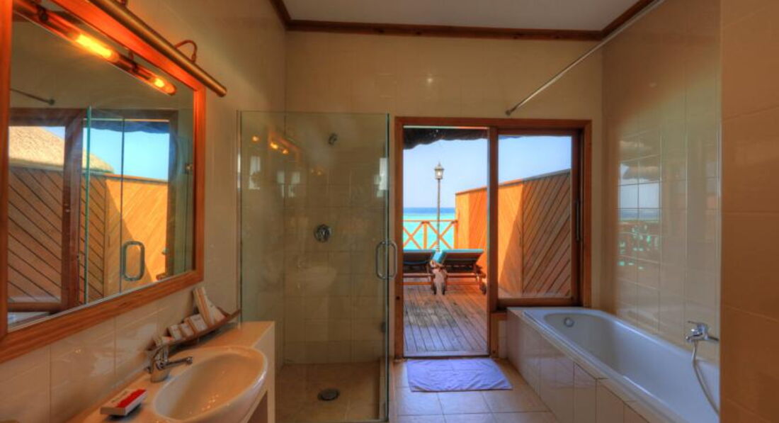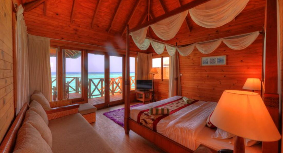 12 Water Bungalow (37 м2, макс. 3 чи 2+1 чол.). Бунгало на палях у водах лагуни. Тераса, ванна, душ. Супутникове ТБ, DVD-плеєр, набір для приготування чаю та кави, ванна, халати та капці, Інтернет Wi-Fi в номері (безкоштовно).