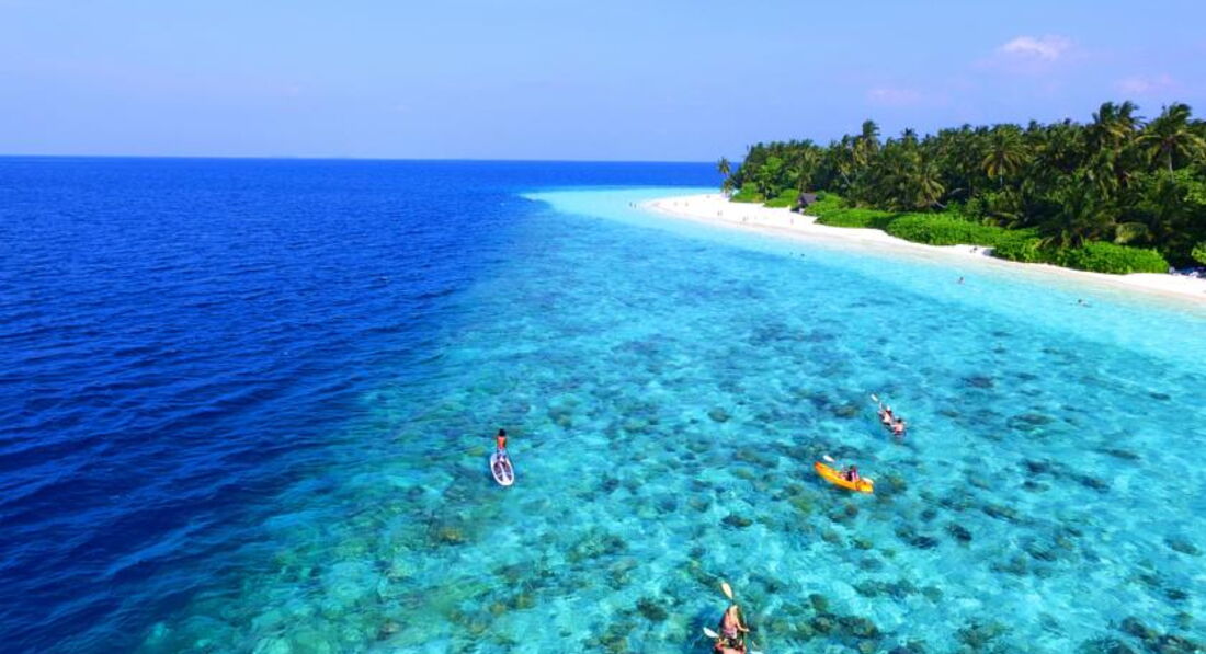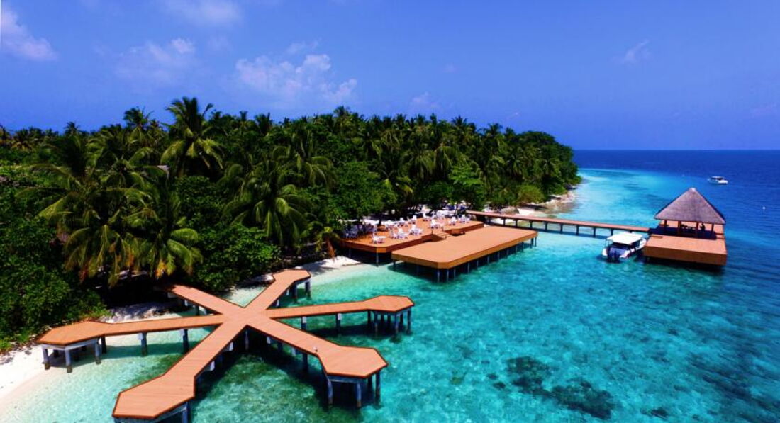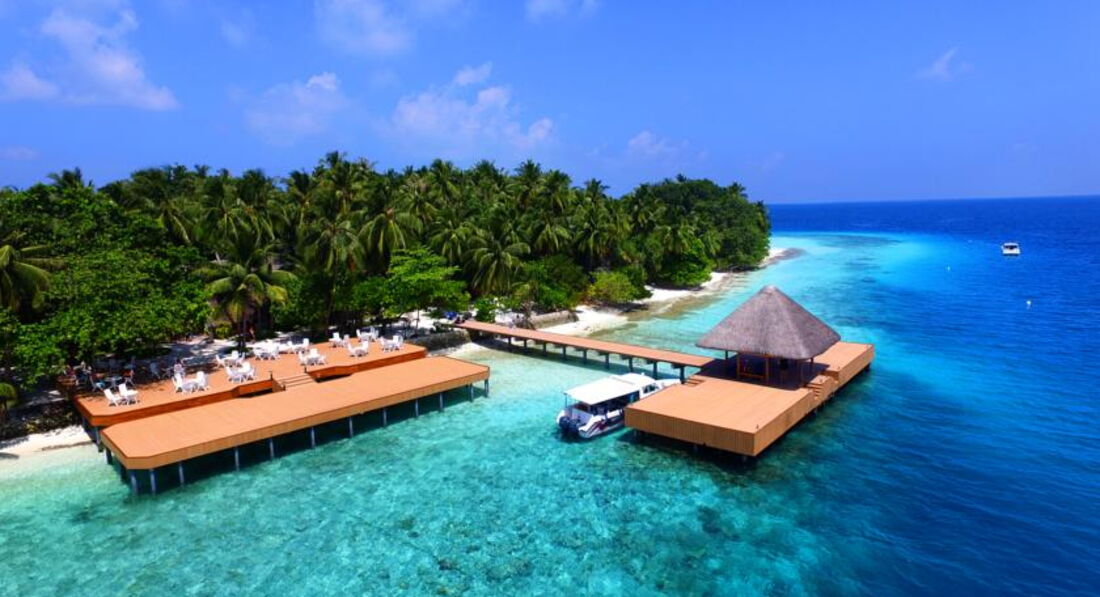 Ездили самостоятельно. Забронировала на Агоде отель, трансфер оплачивала в отеле. Прилетели в 9 утра, написали забрать в 10, в итоге 2.5 часа ждали в аэропорту группу из европы, которая прилетала в 11.10, пока собрались, пока они получили багаж прошел еще час. Добирались в отель на скоростном катере, любуясь бирюзой океана, очень позитивно. Встретили у катера сотрудники отеля с улыбками, провели на ресепшен, угостили холодным соком, очень приятно. Т.к мы приехали на 5 дней, брали только завтраки, на ресепшене нам сказали, что в первый день у вас идет обед шведский стол в подарок, наелись круто, но все напитки даже вода платно. 1,5 бутылка ставят на стол 5$.Вечером в кафе музыка, караоке, напиток маргарита по акции 12,5$+налог. Вино бутылка в ресторане 30$+налог. Мы брали соки и воду с собой.В отеле персонал не говорит на русском языке, поэтому, по приезду, когда нам рассказывали про отель мы половину не поняли, разбирались уже по ходу. В отеле было парочка человек с Украины, парочка болгаров понимающих по русски, но мы толком не общались, это не Турция и Египет, все как отшельники, ходят сами по себе. В основном контингент из Европы, много стариков. Без ласт и масок будет вообще скучно, везите с собой. На территории отеля есть маленький магазинчик, цены там ого-го... Купила фигурку на память со скатом 42$. Футболки Тайские в 10 раз дороже и надпись на них мальдивы.Магниты цена как в аэропорту, кстати в аэропорту выбор больше. Завтраки в отеле шикарные, шведский стол. Очень вкусный салат с тунцом, даже роллы были.Территория отеля не большая, обойти можно за 10 минут. Без специальной обуви купаться можно только на берегу, дальше кораллы и рыбы. Акулки приплывают прямо к берегу. Вечером приплывали скаты.На острове везде растут пальмы, поют птички, как в джунглях. Персонал провожал нас, махая вслед рукой отплывающему катеру, мы махали в ответ. Подарили настольный календарь на память.В целом понравилось, но мое мнение, не стоит таких денег.