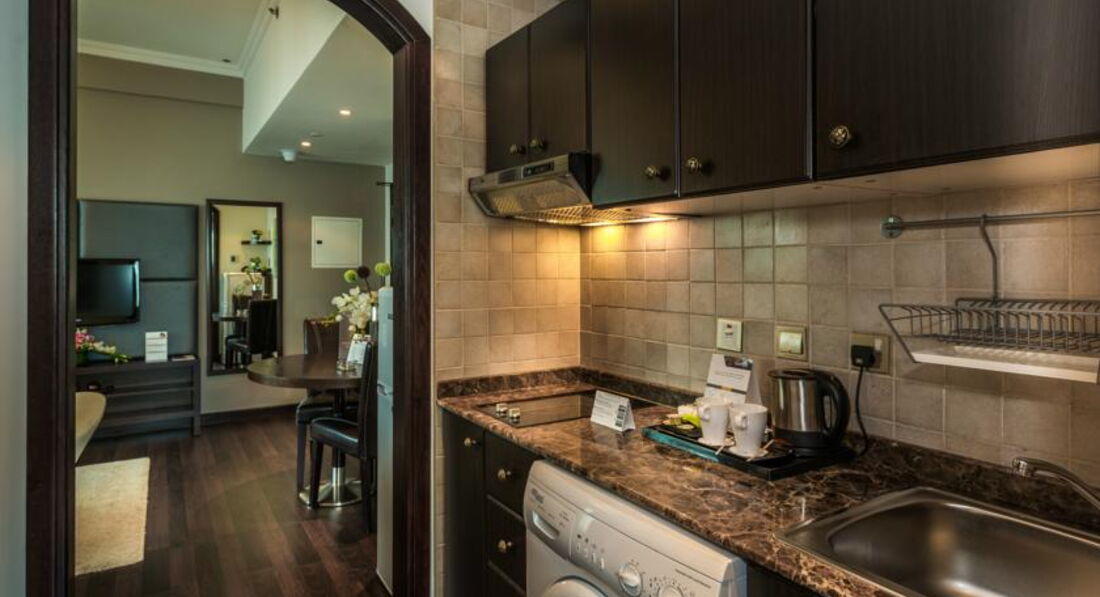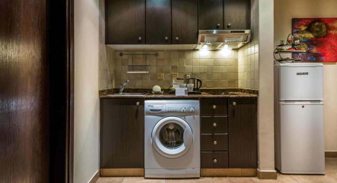 •Міні-кухня (мікрохвильова піч, плита, сковорода, раковина, тарілки, ложки, виделки, ножі, чайник)