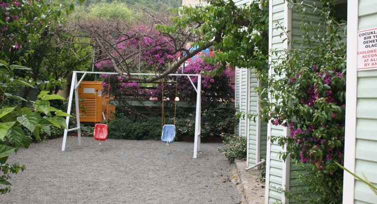 Для детей маленький пластиковый домик с горкой и пластиковая качалка, есть детский лягушатник, но я своего ребенка туда не пускала - в швах плитки зеленые водоросли, чего в большом бассейне не было. отдыхающие турки там купали своих детей и в туалет никогда не водили, думаю - все дети туда писают.