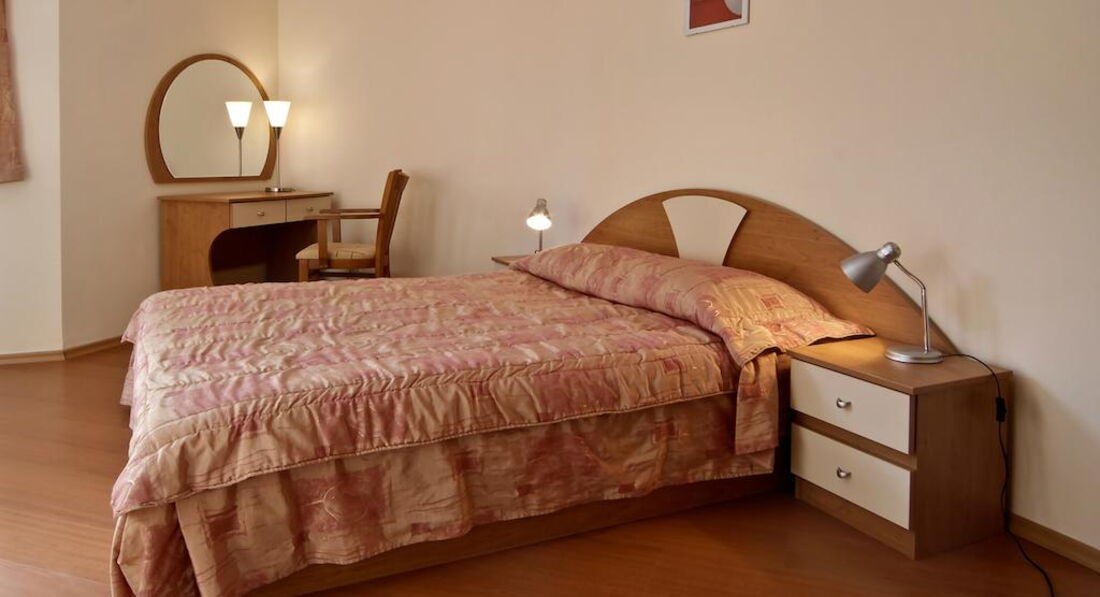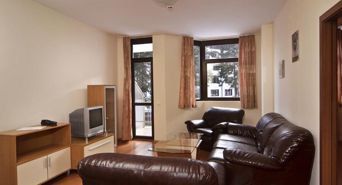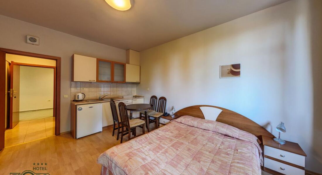 Apartment (спальня з двоспальним ліжком, суміжні двері, вітальня з розкладним диваном та обладнаним кухонним куточком (обідній стіл зі стільцями, холодильник, плита, електрочайник, посуд, столові прилади), макс. 2+2 чол., 80 м2).