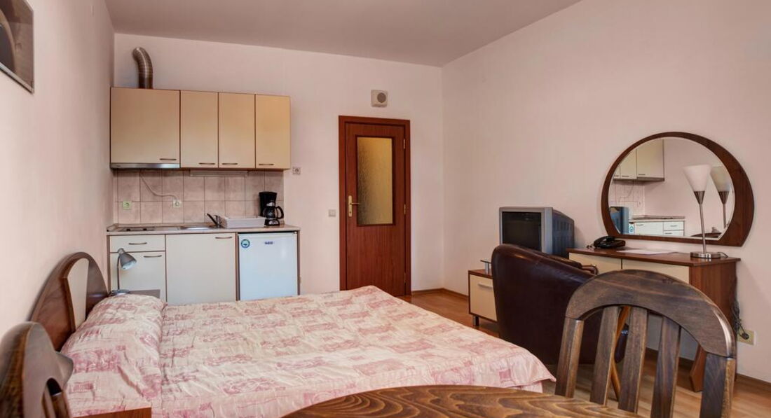 Studio (одна кімната, двоспальне ліжко та розкладний диван, обладнаний кухонний куточок (обідній стіл зі стільцями, холодильник, плита, електрочайник, посуд, столові прилади), макс. 3 чол., 45 м2);