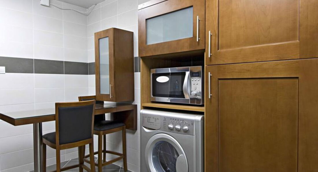 One Bedroom App- хорошие номера с добротной мебелью, кухни со всем необходимым набором посуды, микроволновка, чайник, холодильник, плита, пакетики чай-кофе по приезду, в отдельной комнатке гладильная доска, утюг. Стиральная машинка. Большая спальня, большая гостиная, кухня, совместная ванна-туалет, отдельно туалет. Фен по запросу.