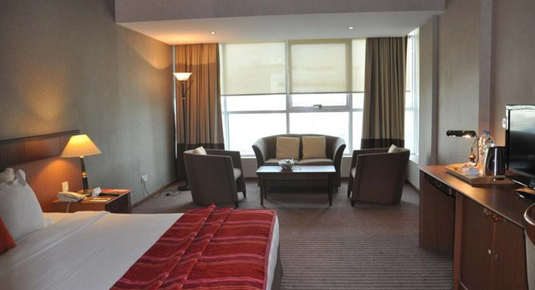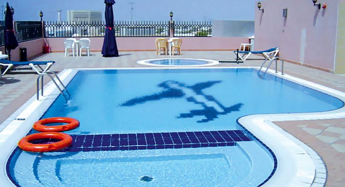 На крыше отеля расположен бассейн, хоть и не глубокий, но можно охладиться. Как раз с крыши отеля можно было разглядеть уже соседний эмират - Шарджа. Единственным минусом я считаю - это близость к аэропорту. Первые 2 дня шум от самолетов мешал спокойно полежать позагорать, а потом мы уже не обращали внимания, привыкли. В номерах есть кондиционеры, хоть и простые, но все равно по легче. Балконов нет. Рядом с отелем расположена заправочная станция и какой-то автосервис по типу наших шиномонтажек, поэтому днем можно было услышать так же лишний шум. Но я это не считаю минусом. Мы заметили это только на середине пребывания, т.к. постоянно гуляли и днем не сидели в номере. Ну если вы приехали в ОАЭ лежать в отеле и смотреть ТВ, тогда этот шум может вас отвлекать, а если загорать и отдыхать, тогда не думаю, что он вам навредит. К тому же по ночам ничего подобного не было :)