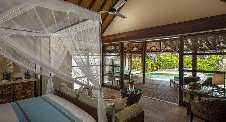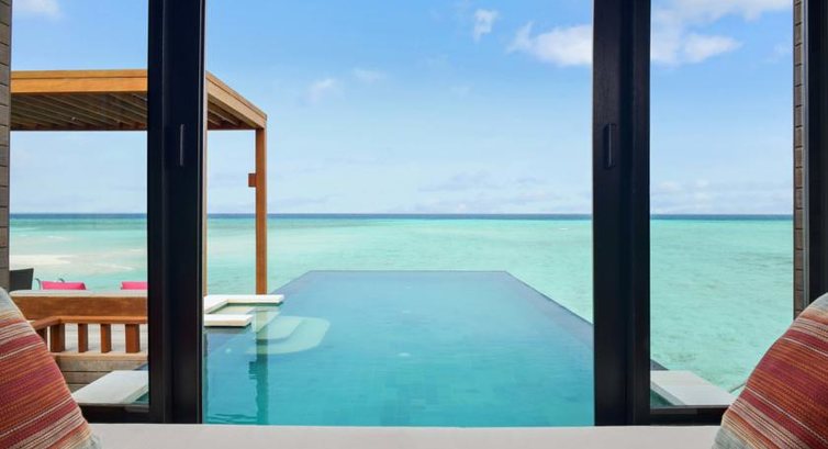 4 One-bedroom Water Suite (вид на схід або захід сонця, 91 м², макс. 4 або 2+2 чол.). Водні бунгало: спальня, простора вітальня, 2 тераси. Прямий доступ до моря. При розміщенні з дітьми віком до 8 років батьки повинні підписати спеціальний документ (Liability Form).