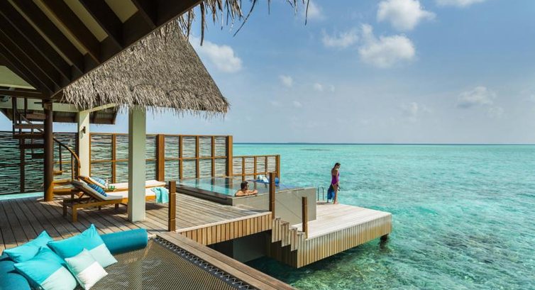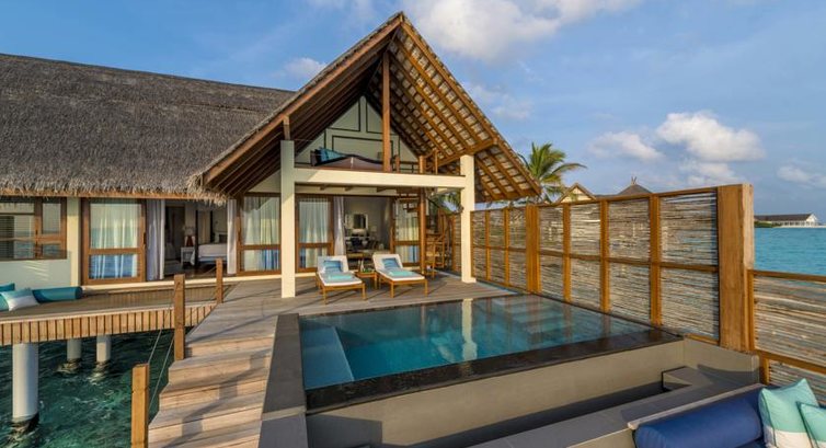 2 Two-bedroom Water Suite (182 м², макс. 6 або 4+2 чол.). Водні бунгало знаходяться біля північно-західного закінчення острова. Велика відкрита зона (200 м2) з терасою, шезлонгами, оглядовим майданчиком з диванами; на нижньому рівні басейн (16 м2), платформа з душем; зона вітальні з обіднім столом над басейном та терасою; 2 спальні, що мають спільну зону відпочинку, велику ванну кімнату з двома раковинами, ванною та душовою кабінкою. Душ на вулиці.