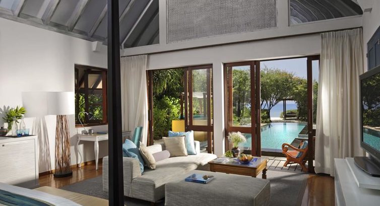 1 Two-bedroom Royal Beach Villa (310 м², макс. 6 або 4+2 чол.). Розкішна берегова вілла розташована на західному кінці острова, на березі океану. Велика відкрита територія (890 м2), басейн (98 м2). Складається з основної спальні, відкритого павільйону вітальні/їдальні та гостьової спальні, з'єднаних тиковими відкритими верандами. Відкритий обідній павільйон над басейном (20 м2). Крита їдальня на 8 чол., повністю обладнана кухня (холодильник, мікрохвильова піч, тостер, соковитискач, кавоварка). У кожній спальні – кондиціонер, місце відпочинку. У внутрішньому дворику масажний стіл, шезлонги. Велика ванна кімната з двома раковинами, душ всередині і душ просто неба.